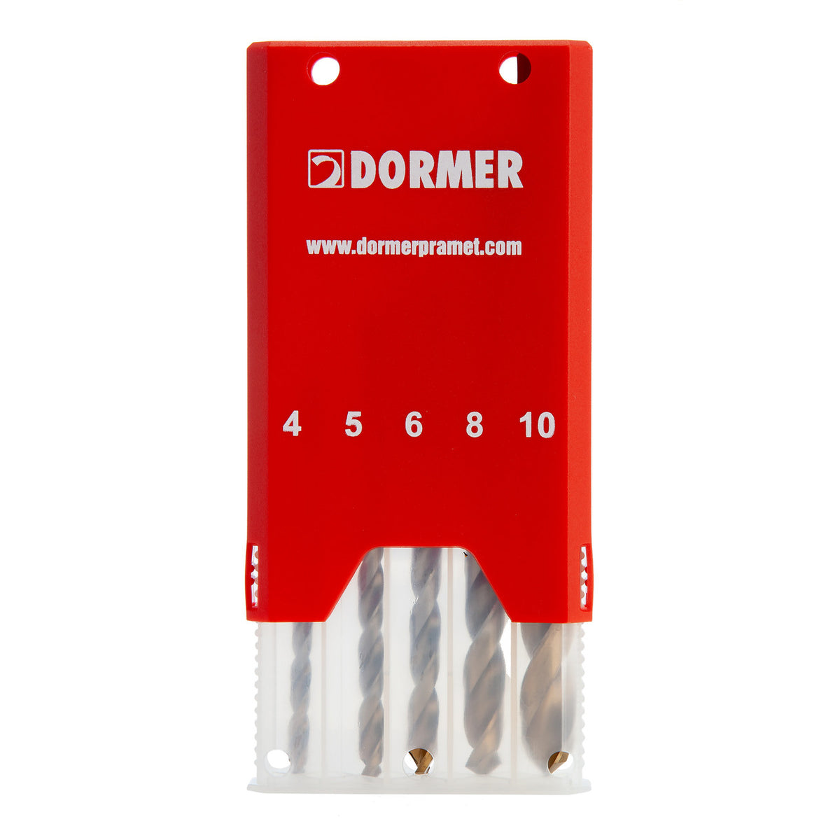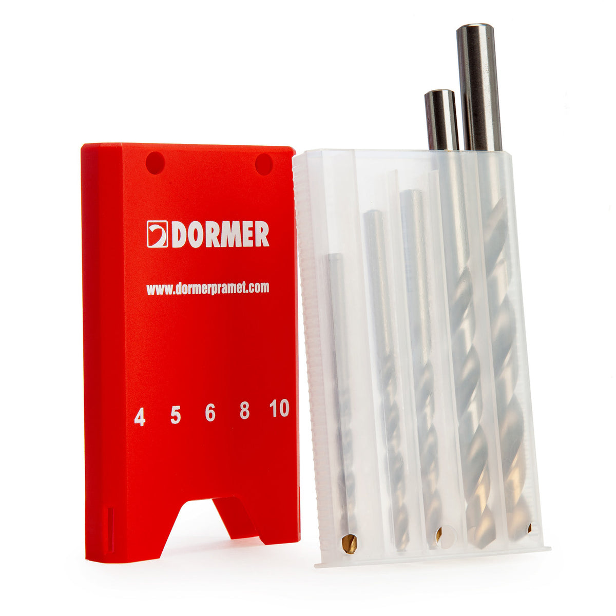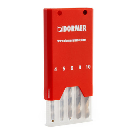 The Dormer A089 10 Set is a pack of 5 TiN coated tipped HSS jobber drills in a plastic case. The drills range in size from 4mm to 10mm for general purpose drilling in a wide range of materials. The plastic box has a slide-off top for easy selection.