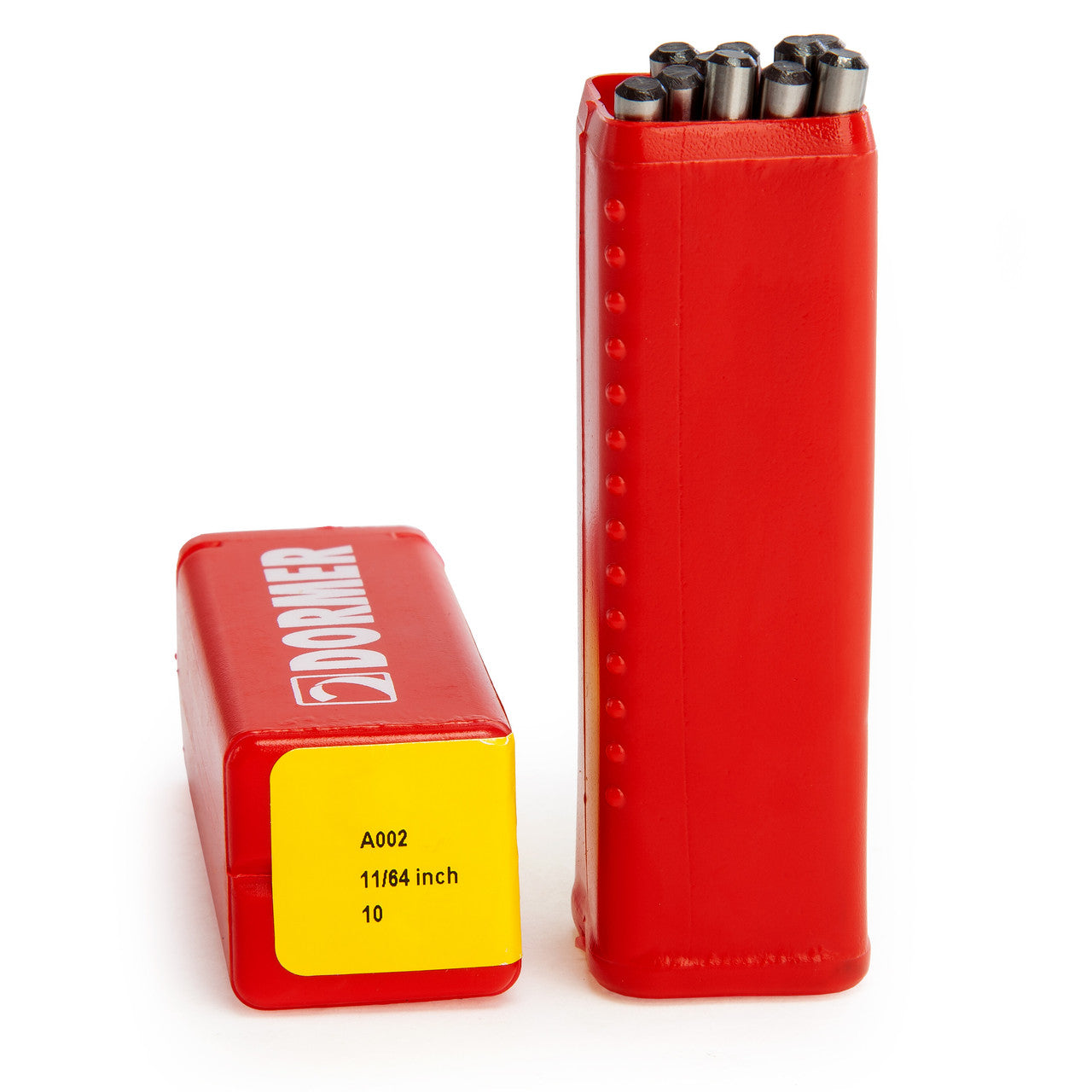 The Dormer A00211/64 Pack of 10 General Purpose Jobber Drill Bits have an 11/64in diameter with an overall length of 70mm and flute length of 38mm and are made from high-speed steel. They are great for drilling in steel, aluminium and plastic thanks to their Titanium Nitride coated tip which also ensures longer life.