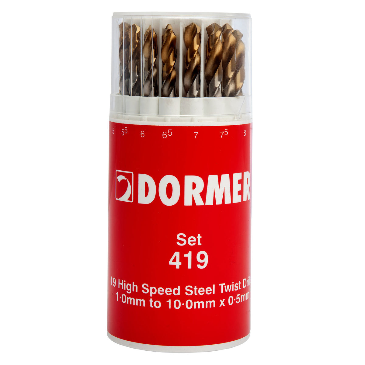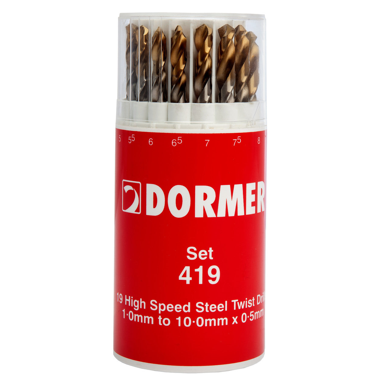 The Dormer A094419 is a 19 piece A002 jobber drill bit set designed for drilling in materials such as steel, cast iron, plastic and more. These general-purpose drill bits feature Tin coated tips for long life and improved performance. The 118-degree split point aids self-centring when used by hand and also reduces the push force required. Contains: 1.0, 1.5, 2.0, 2.5, 3.0, 3.5, 4.0, 4.5, 5.0, 5.5, 6.0, 6.5, 7.0, 7.5, 8.0, 8.5, 9.0, 9.5 and 10mm drills.