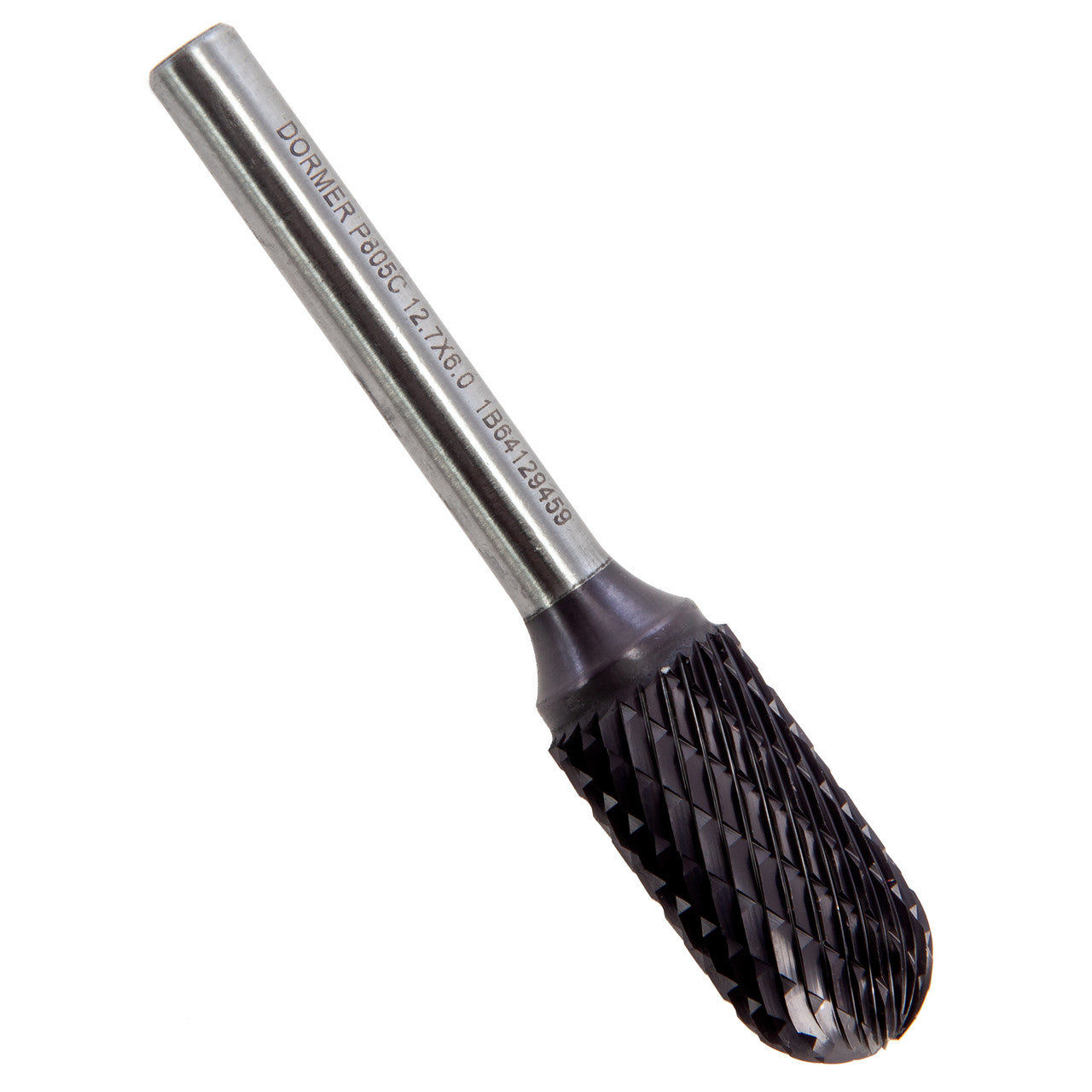 This Dormer P805C is a Rotary Burr with ball nose (C shape), diameter 12.7mm with 25mm length of cut, 70mm overall length and 6mm shank. Carbide tipped with toughened and hardened steel shank and TiAlN coating, DC double cut flute style with close spaced edges for machining contours and circular arcs in steel and cast steel, stainless steel, cast-iron, copper or copper alloys, high-temperature alloys, hardened materials.