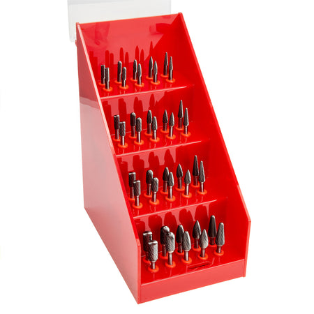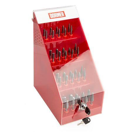 The Dormer P89001 is a Rotary Burr Assortment in a Counter Dispenser, consisting of 40 carbide Burrs. With DC double cut flute style with close spaced edges for steel and cast steel, stainless steel, cast-iron, copper or copper alloys, high-temperature alloys, hardened materials, diameters 6.0, 8.0, 9.6 and 12.7 mm with 6 mm shank, 2 off each P803 cylinder burr with end cut (B shape), P805 cylinder burr with ball nose (C shape), P811 rounded tree burr (F shape), P813 pointed tree burr (G shape) and P821 ball-nosed cone burr (L shape)