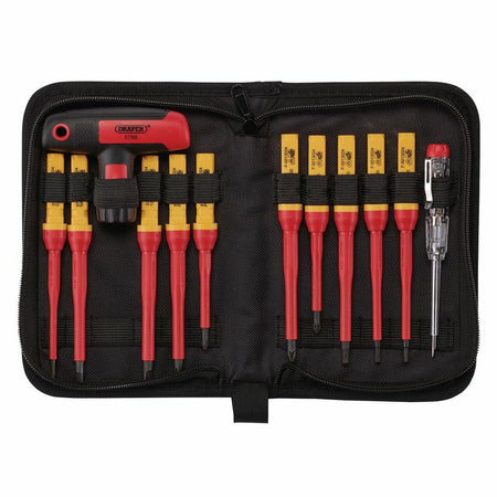 The Draper 37797 VDE approved screwdriver set with interchangeable blades is suitable for working on live electrical circuits up to 1000V AC or 1500V DC. Features a screwdriver with T-handle and soft grip for comfort. There are 10 steel screwdriver blades with magnetised tips and a phosphate finish. The interchangeable blades lock securely into the T handle and there is an easy-to-use twist release button for when changing blades. The set includes a single-pole voltage tester (up to 240V) and all tools are supplied inside a soft storage zip case with elasticated straps to hold all the components securely in place.