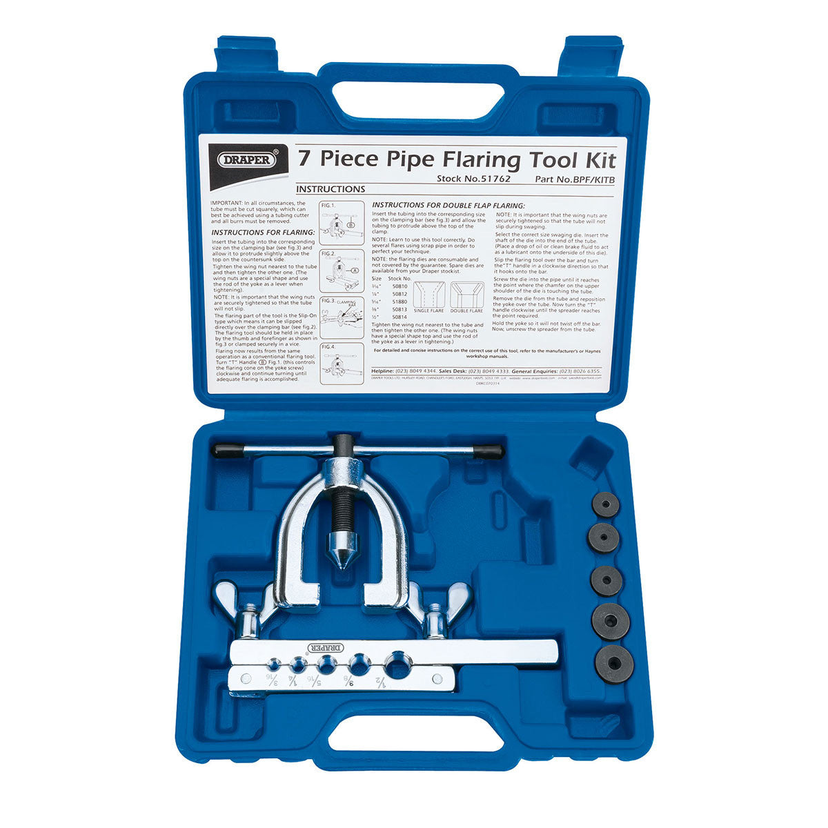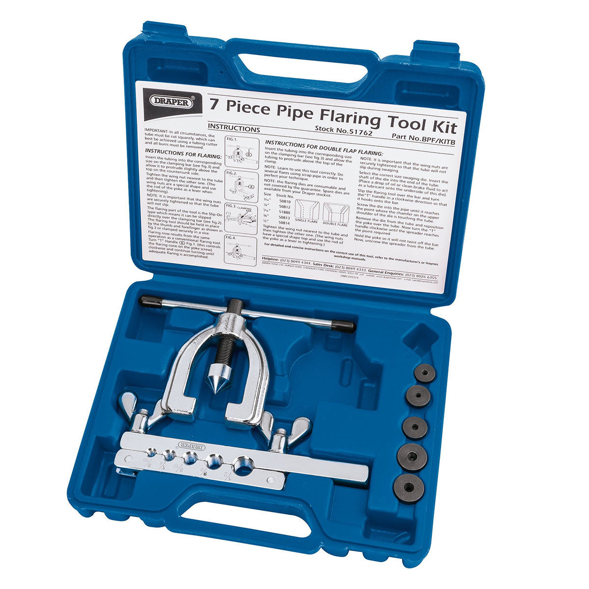 The Draper 51762 brake pipe flaring tool kit is designed for use with single and double lap flares in soft copper and Aluminium pipes with outside diameters of 3/16, 1/4, 5/16, 3/8 and 1/2". This kit contains a pipe clamp, 45° spreader and five dies all stored in a handy plastic case.
