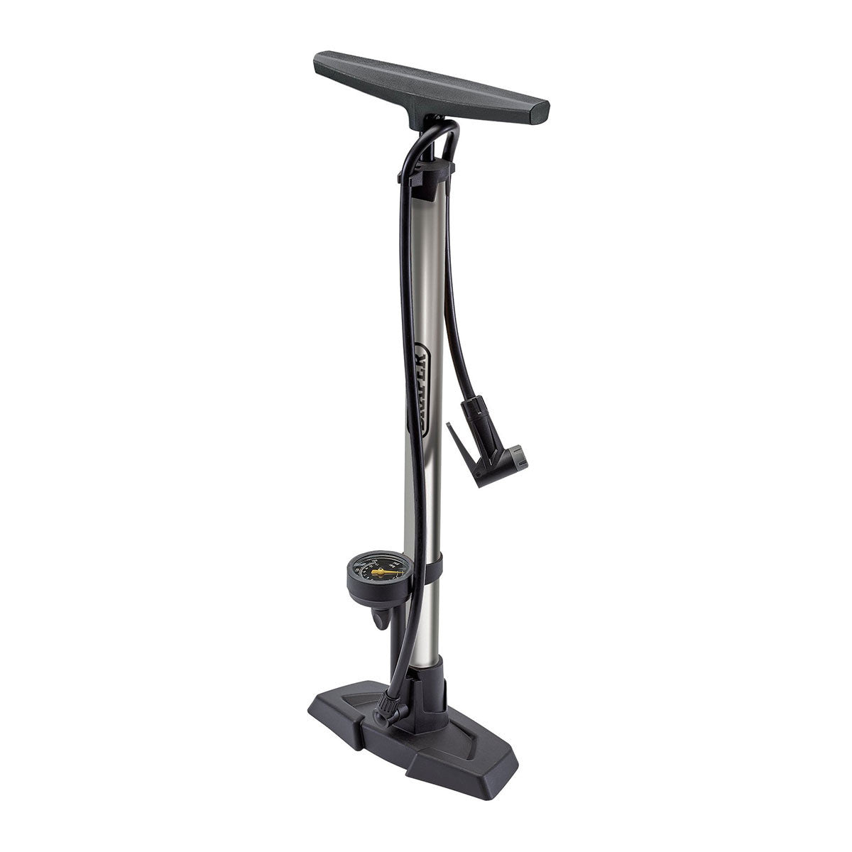 - Durable steel track pump with a clever auto-fit dual connector head designed to fit both Schrader and Presta valves