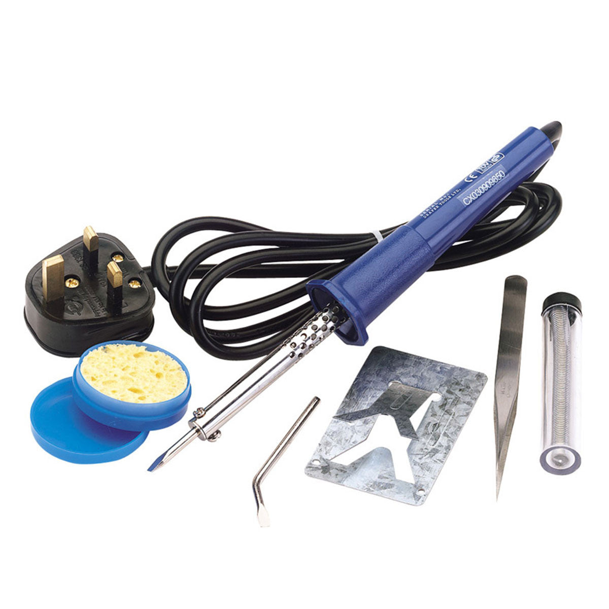 The Draper 71415 is a 25W soldering iron suitable for a variety of soldering purposes. It comes with a straight tip, a tube of solder, bent tip, tweezers, stand and sponge.