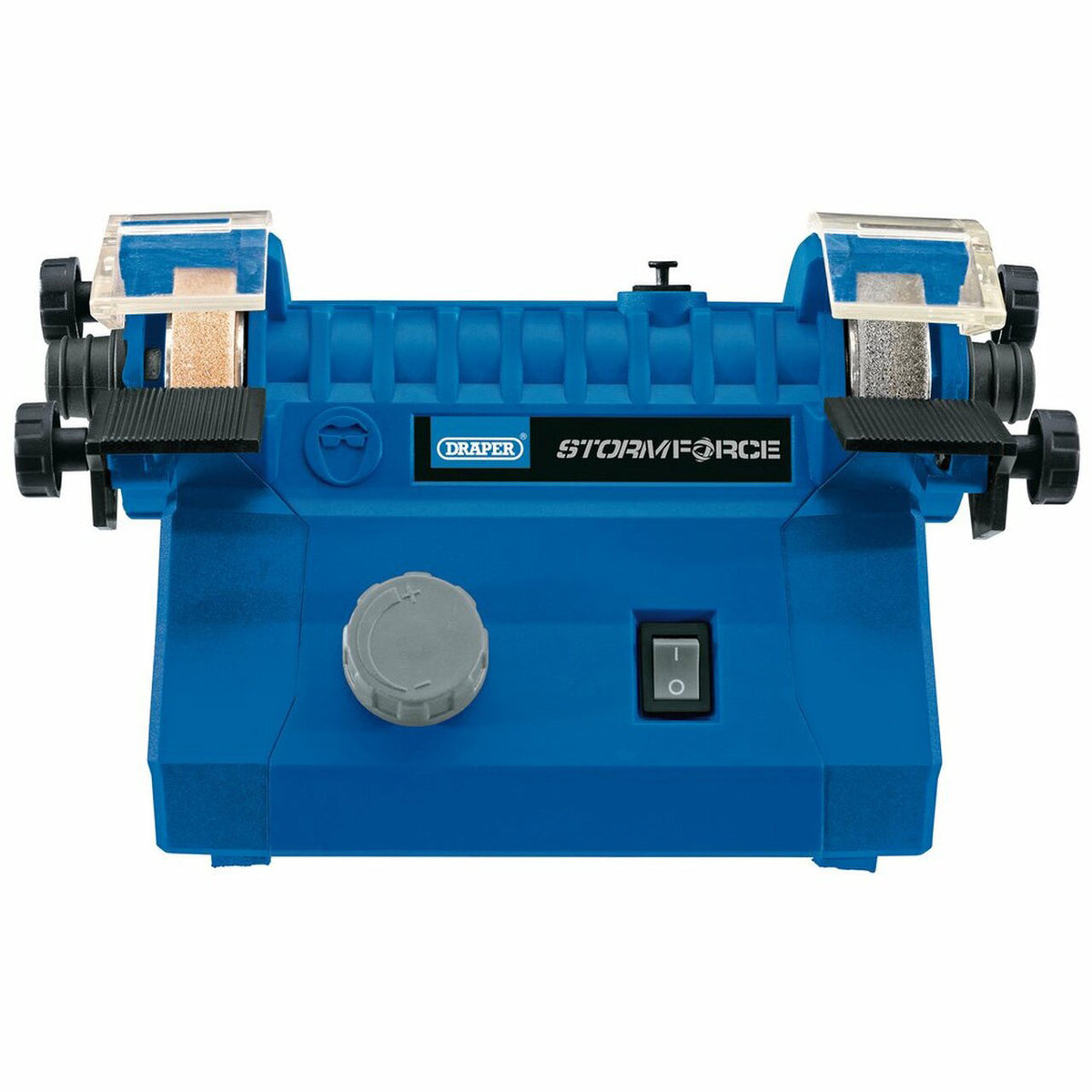 The Draper 79908 is a 240V Mini Bench Grinder powered by a 100W motor, a part of the Draper Storm Force range. The 79908 features variable speed for greater control when working as well as an eye protection shield for added safety.
