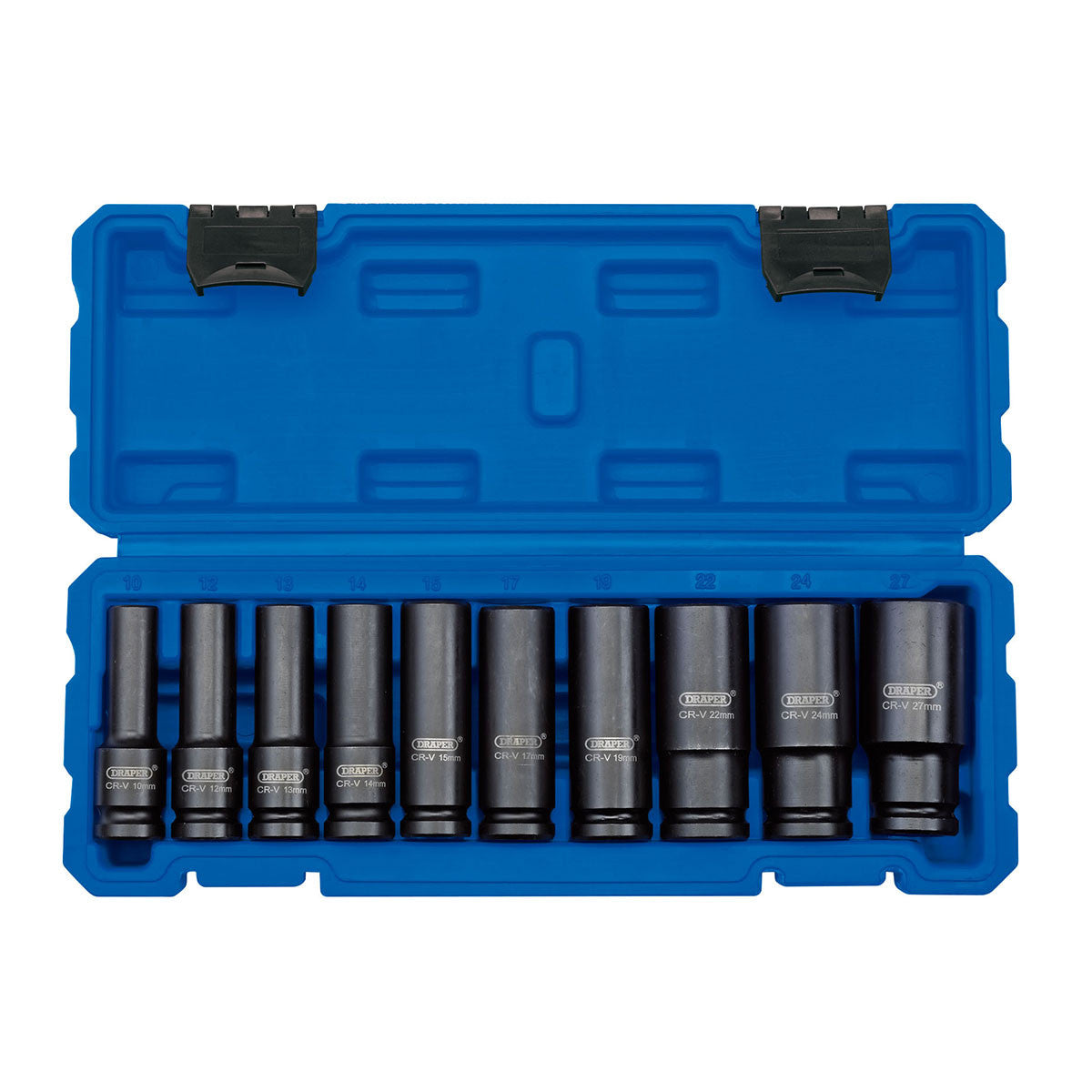 The Draper 83096 is a 10 piece 1/2 inch metric deep impact socket set containing sockets ranging in size from 10-27mm. These sockets have a square drive and are forged from chrome vanadium steel for durability and protection against rust. This kit comes sold in a plastic carry case.