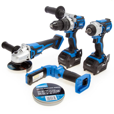 This 4 piece kit from the Draper 20V range contains a combi drill, impact wrench, 115mm angle grinder, and inspection lamp