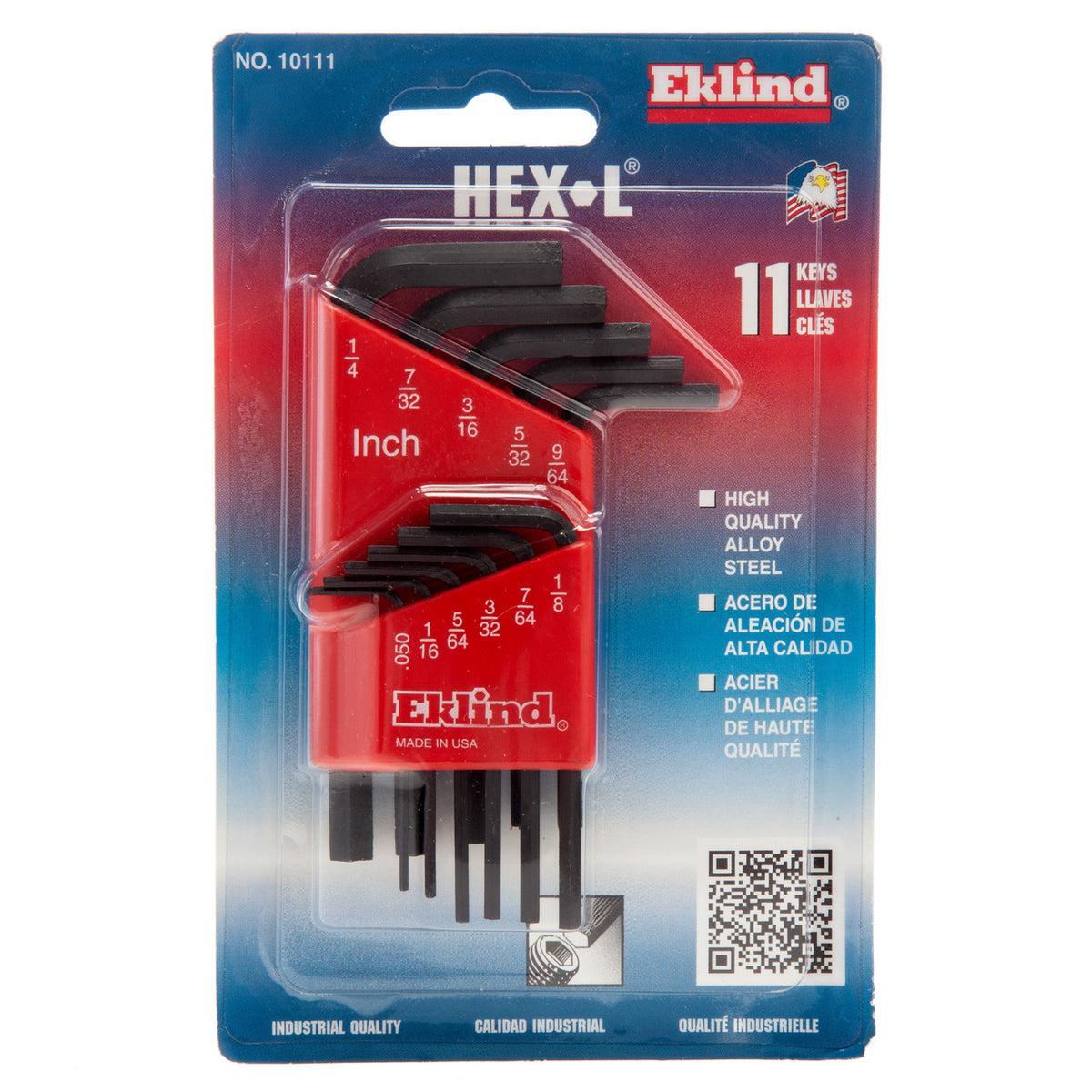 The Eklind 10111 Hex-L Key Set is an 11 Piece Set in a plastic holder which is coded red to denote Imperial measurement. The keys are made from alloy steel with a black finish in sizes .050, 1/16, 5/64, 3/32, 7/64, 1/8 , 9/64, 5/32, 3/16, 7/32, & 1/4 inches.