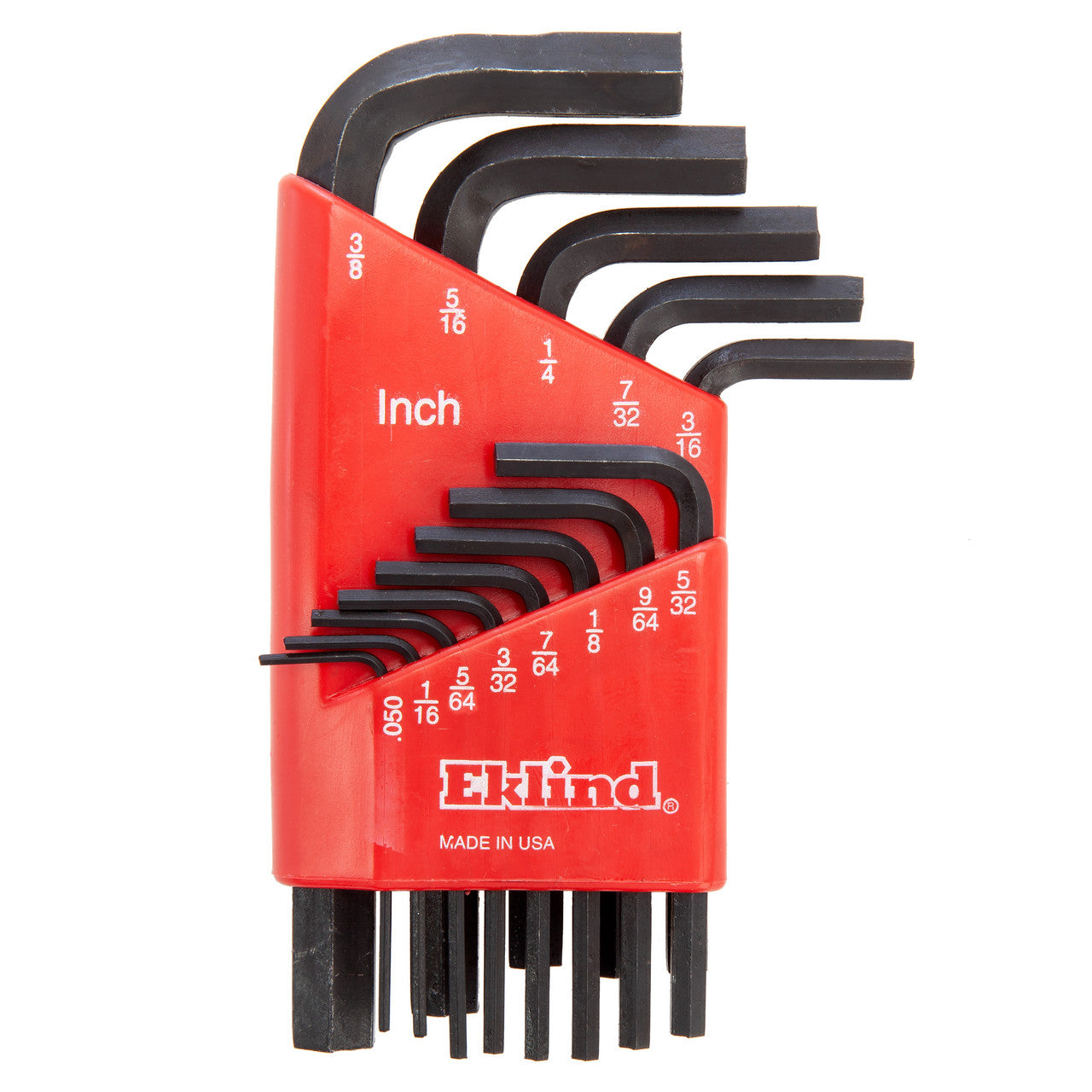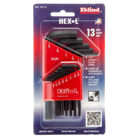 The Eklind 10113 Hex-L Key Set is a 13 Piece Set in a plastic holder which is coded red to denote Imperial measurement. The keys are made from alloy steel with a black finish in sizes .050, 1/16, 5/64, 3/32, 7/64, 1/8 , 9/64, 5/32, 3/16, 7/32, 1/4 , 5/16, & 3/8 inches.