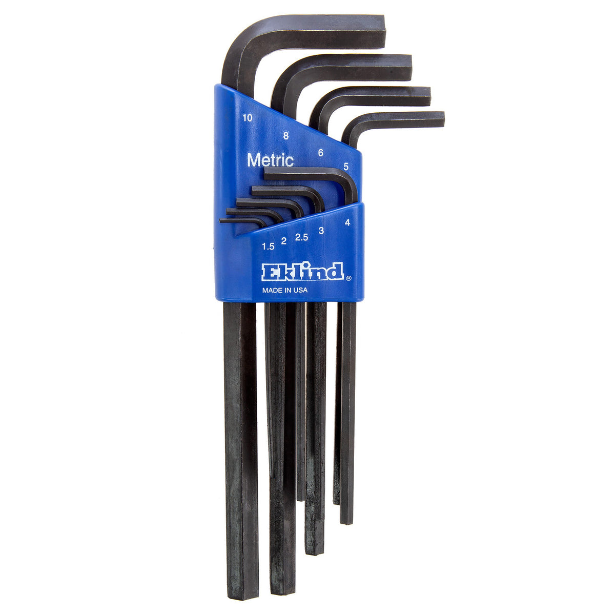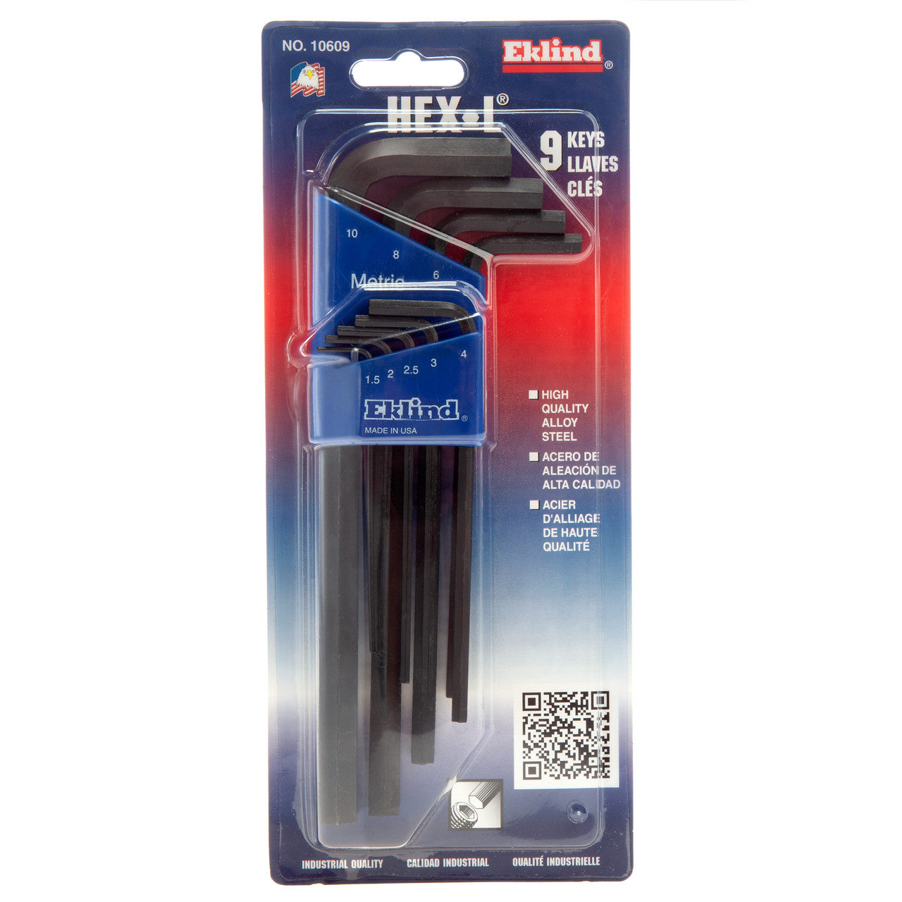 The Eklind 10609 Hex-L Key Set is a 9 Piece Set in a plastic holder which is coded blue to denote Metric measurement. Long arm sizes are for extra reach and leverage. The keys are made from alloy steel with a black finish in sizes 1.5, 2, 2.5, 3, 4, 5, 6, 8, & 10mm.