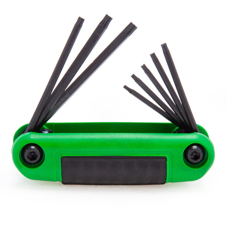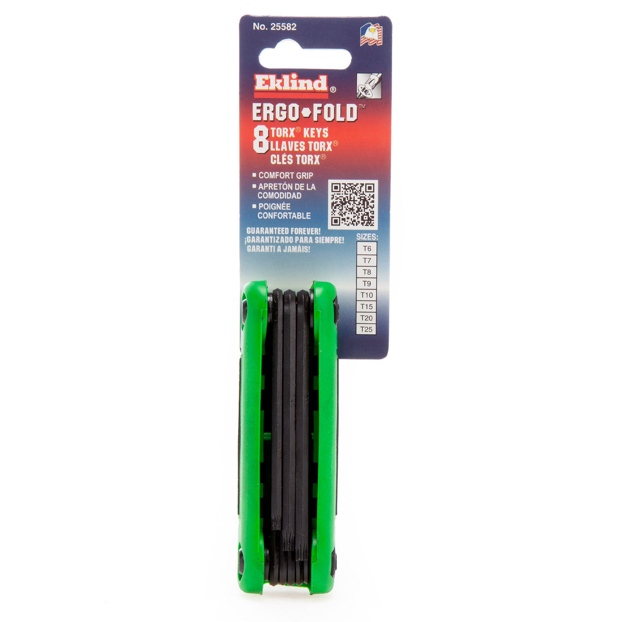 The Eklind 25582 Torx Ergo-Folding Key Set consists of 8 Keys in a case colour coded green. Industrial grade professional tools made from Eklind heat treated alloy steel. The Torx sizes are: T6, T7, T8, T9, T10, T15, T20, & T25 keys.