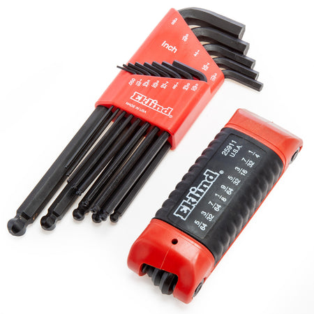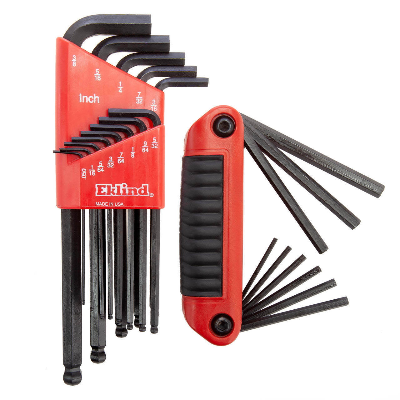 The Eklind 13213 is made from high-quality alloy steel. The ball profile on the long arm provides 360 degrees of rotation. at up to a 35 degree angle allowing easy access to hard-to-reach fasteners. Eklind long imperial ball end hex - allen keys x 13 in a red compact holder firmly retains each key in a size marked hole. American-made using Eklind Alloy Steel to exceed ANSI standards. Includes 0.050 , 1/16 , 5/64, 3/32 , 7/64 , 1/8 , 9/64 , 5/32 , 3/16 , 7/32 , 1/4, 5/16 , 3/8" keys.