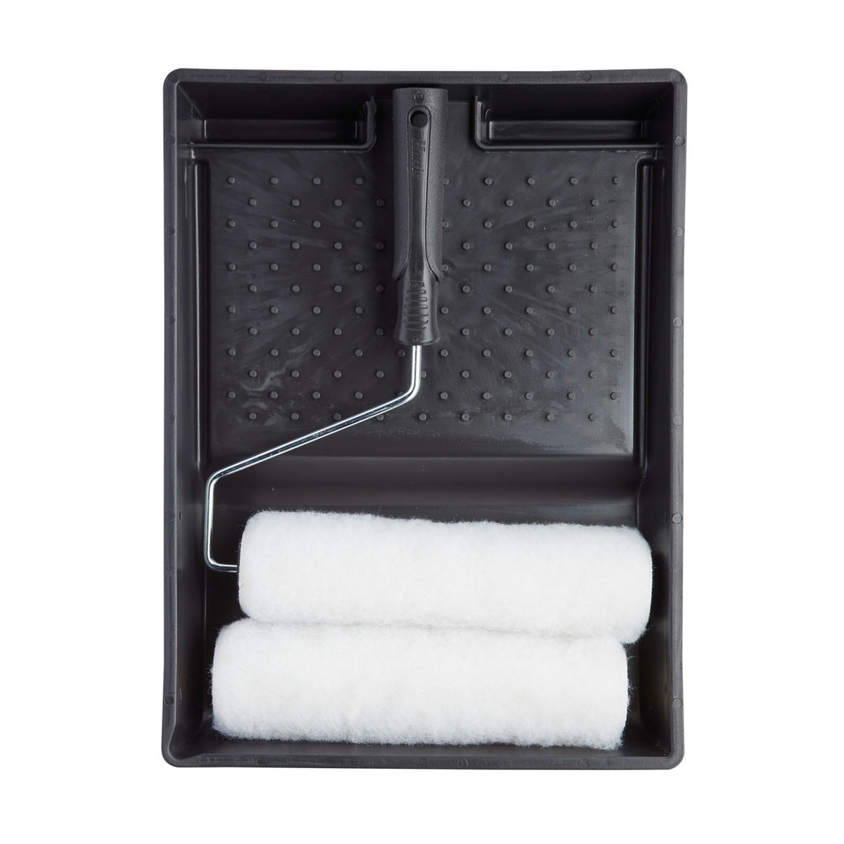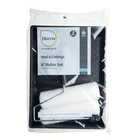 The Harris 101092005 walls and ceilings roller set is ideal for general painting on large interior flat walls and ceilings. For best results, rinse roller sleeve before use to remove any loose fibres. After use with water based paints, such as emulsion, remove the excess paint with a multi-tool. Then wash in warm soapy water. Use the multi-tool to scrape over the surface of the roller to ensure all paint is removed. Allow to dry standing up.