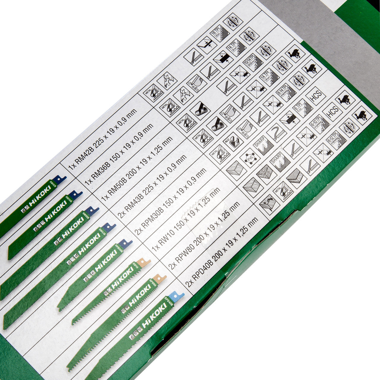 HiKOKI 752049 an assorted reciprocating saw blade set for cutting a variety of materials like wood, metal and PVC pipes