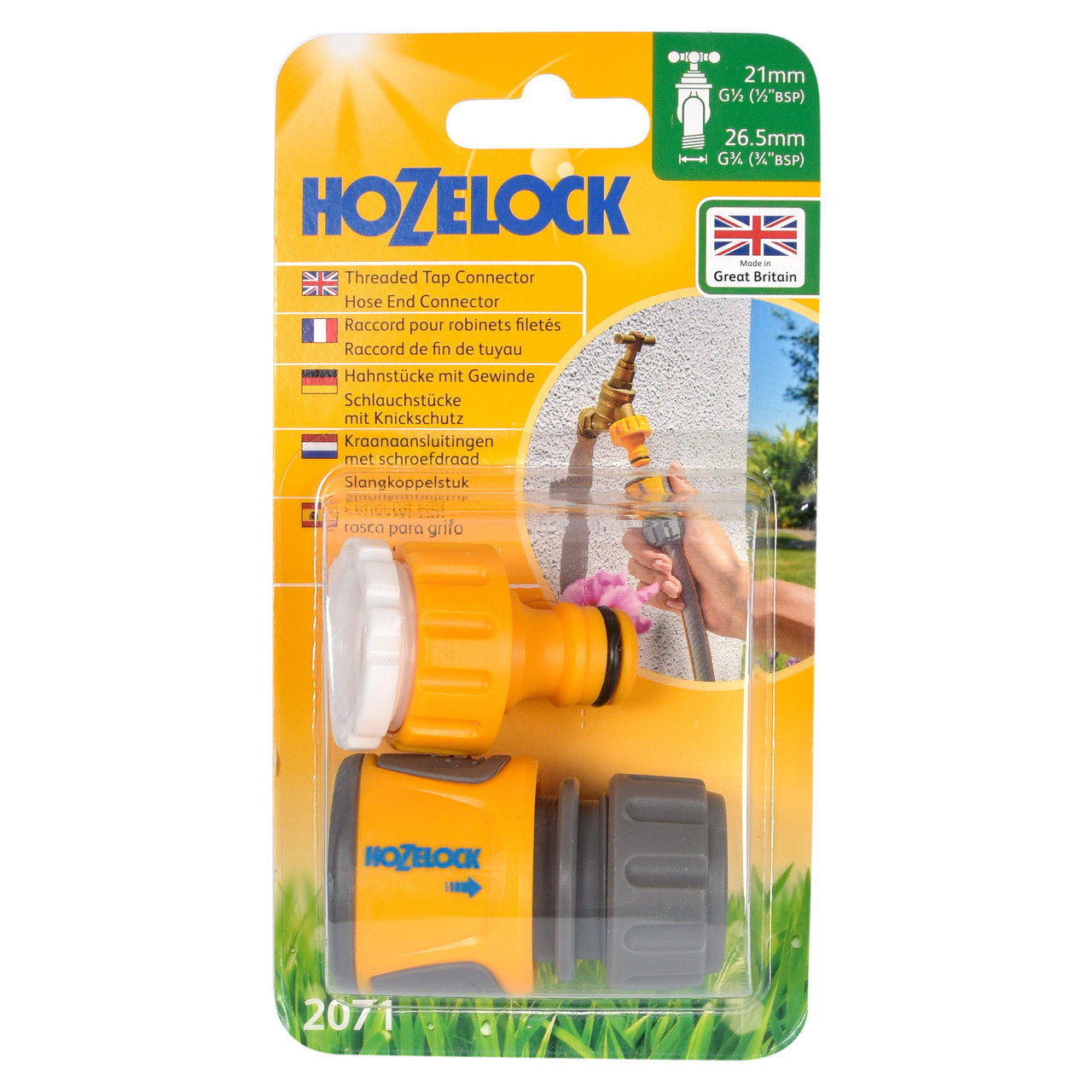 The Hozelock 2071 consists of the Hozelock 2175 Threaded Tap Connector which fits 95% of all outdoor taps with 21 - 26.5mm (1/2” & 3/4″) threads. Also includes the Hozelock 2070 Hose End Connector for 12.5mm and 15mm hoses, with Twin Soft Touch pads to provide a comfortable grip for easy connection/disconnection even when wet.