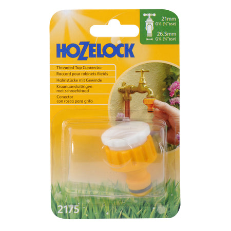 The Hozelock 2175 Threaded Connector is suitable for use with 95% of all outdoor taps. It is compatible with Screw Thread 1/2" BSP (21mm), 3/4" BSP (26.5mm).