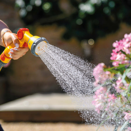 The Hozelock 2679 Multi Spray Gun with five spray patterns for garden watering and cleaning tasks