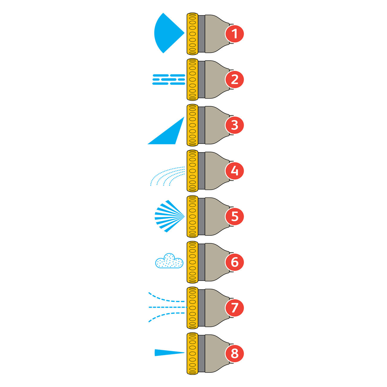 - Eight spray patterns – Cone for delicate watering (1), Powerful jet for cleaning (2), Angled for producing a flat spray (3), Fine Rose for gentle watering (4), Flat for rinsing soap off cars (5), Fine Mist for seedlings (6), Shower for producing a soft flow (7) and Centre flow for cleaning (8)