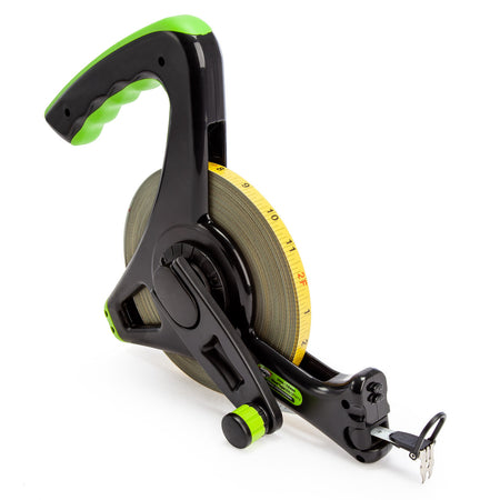 The Imex 006-SP5013 steel tape measure is a high-end, robust and super-accurate steel 50m long/surveyors' tape measure engineered for the professional user. The long steel blade comes complete with a nylon laminated coating which helps deliver outstanding life span. The main point users stick with this tape over fibreglass one is that this steel tape does not stretch or rust. Featuring both metric and imperial graduations (metric on one side, imperial on the other) along its length for maximum convenience and topping out at 13mm wide for easy reading. The blade is easily cleaned and maintained thanks to the open 'Z' frame case design. The tape has a great soft handle grip and a cushioned end that stopped the tape hitting hard at the end when winding it in. The blade is withdrawn back into the case by a dual-action winder, right-handed and left-handed folding handle and is rewound incredibly smoothly thanks to its balanced, scaled diameter blade drum. Unlike most long tapes (or surveyors' tapes as they're commonly known) this product has a blade locking mechanism providing for a firm blade hold. These days getting the job done right first time is critical. With the Imex Large Steel 'Z' Handled tape range you can have the confidence in taking the reading and knowing its right over and over again, this Imex Storm Large steel tape measure will last for many many years.