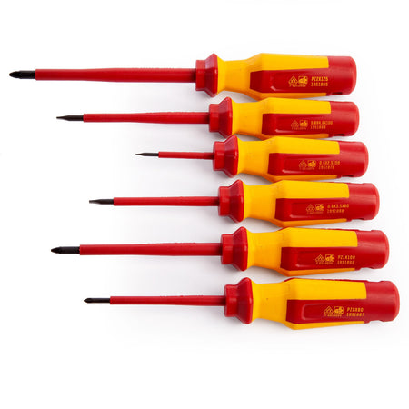 The Irwin 1951884 VDE Screwdriver Set contains 6 screwdrivers in the following sizes: Parallel 2mm x 50mm, 3.5mm x 80mm, 4mm x 100mm, PZ0 x 80mm, PZ1 x 100mm, PZ2 x 125mm. Their chrome vanadium shafts offer the ultimate protection against corrosion for long life and maximum durability. They are insulated up to 1000V making them ideal for electrical use.