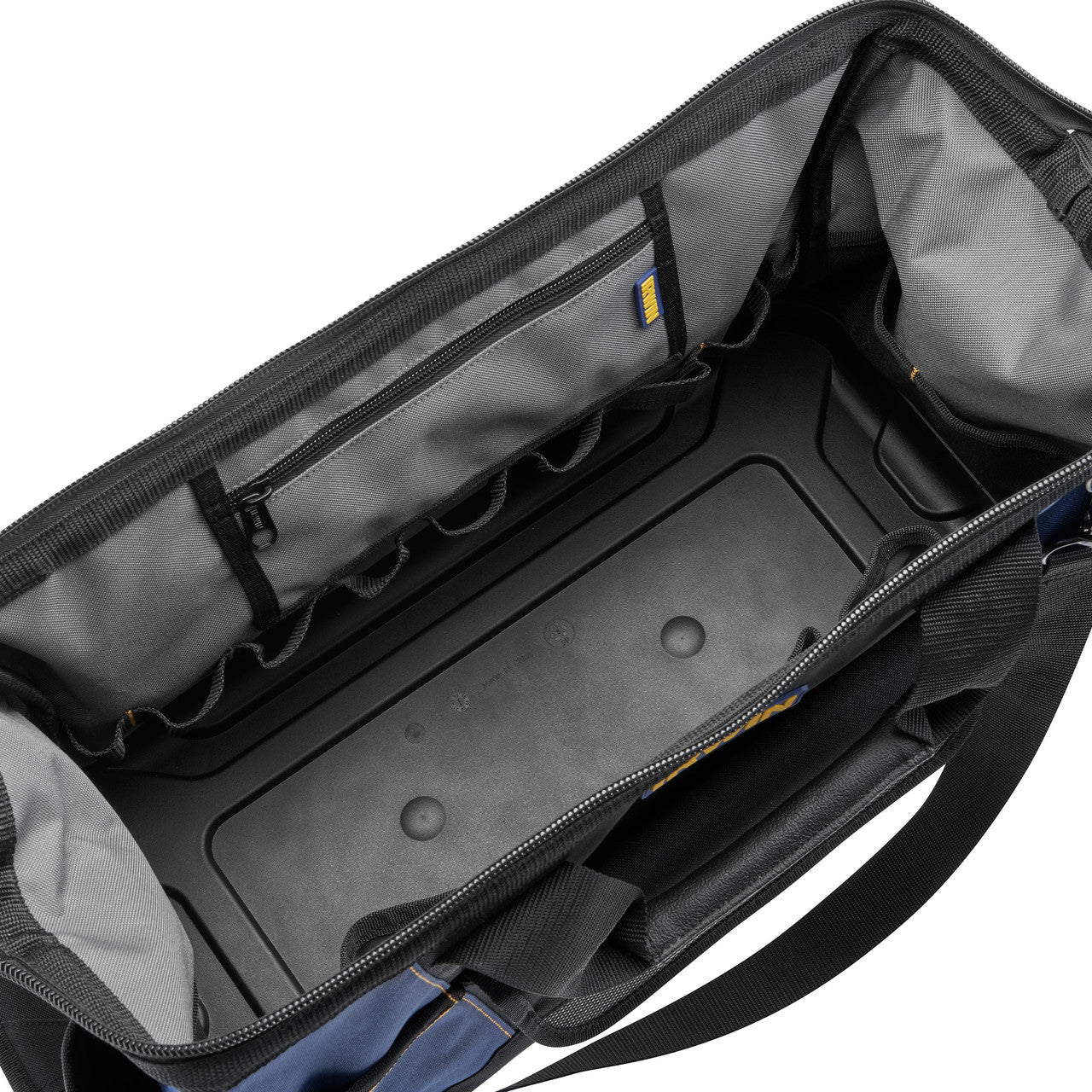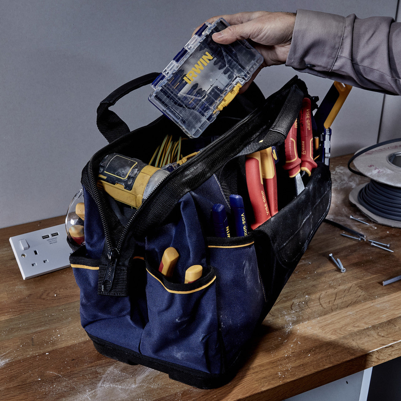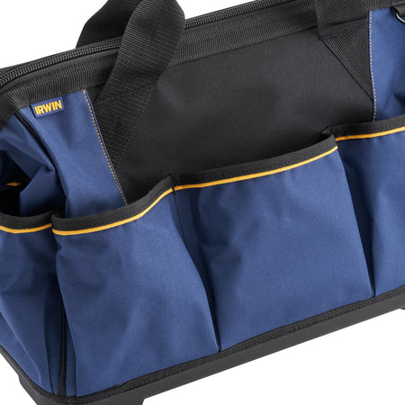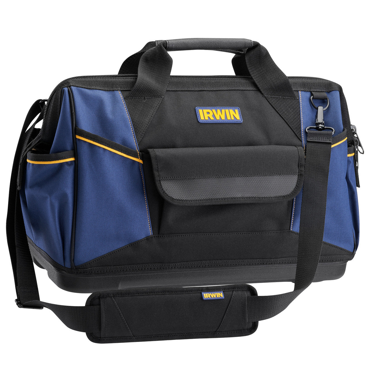 The Irwin IWST93170-1 Large Open Mouth Bag is made from strong, 600 denier fabric that resists wear and tear for lasting durability. It has a large opening of 50cm x 20cm for easy access and tool selection. It can also be fully closed with a heavy-duty zip. With 10 external and 17 internal pockets for orderly vertical storage of tools.