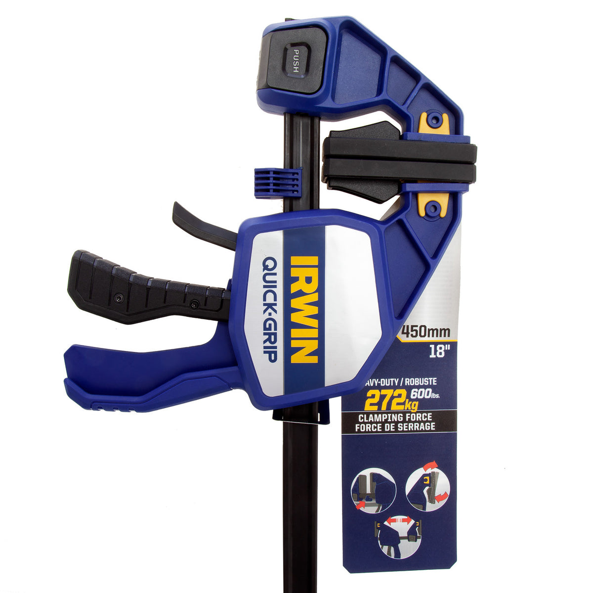 The IRWIN 10505944 QUICK-GRIP 18 Inch Heavy-Duty One Handed Bar Clamp evenly distributes up to 272kg (600 lbs.) of sustained clamping pressure. It is one of the top-performing One-Handed Bar Clamps available. The Clamp / Spreader has improved ergonomics for increased comfort and Quick-Change screw mechanism for holding the jaw firmer. Quick tool-free change from clamp to spreader. Full face pads distribute pressure evenly while supporting foot allows clamp to sit parallel. Specially designed for gluing applications.