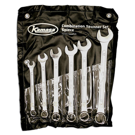 The Kamasa 55984 is a 6-piece metric combination spanner set, manufactured from Chrome Vanadium with recessed panel polished heads & supplied in a plastic wallet for a handy storage.