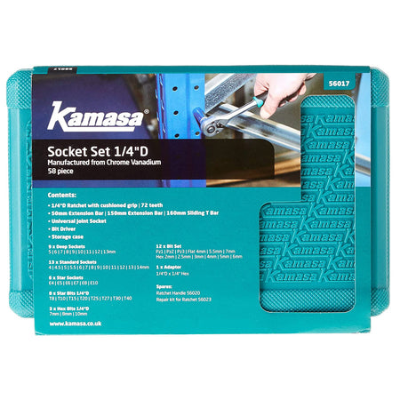 The Kamasa 56017 is a 58-piece, 1/4 inch square drive socket and bit set. It including deep, standard and star sockets, star and Hex bits; driver bit set and accessories. Manufactured from Chrome Vanadium, the set comes in a neat storage case.