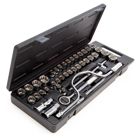 The Kamasa SS4849 is a 42 piece, 1/2” drive socket set, including metric, AF and Whitworth Bi-Hex (12pt) sockets manufactured from chrome vanadium. Together with 6 complimentary accessories, including: a 1/2” drive reversible ratchet, sliding T-bar, speed brace, universal joint and two extensions; supplied in a blow mold storage case for safe storage.
