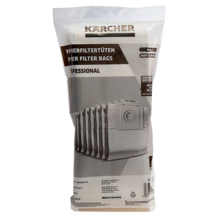 The Karcher 6.904-333.0 is a Pack of 10 genuine OEM paper filter vacuum bags to fit the T7/1, T7/1 eco!efficiency, T9/1 Bp, T9/1 Bp Pack, T10/1 and T10/1 Advanced. Not suitable for wet cleaning.