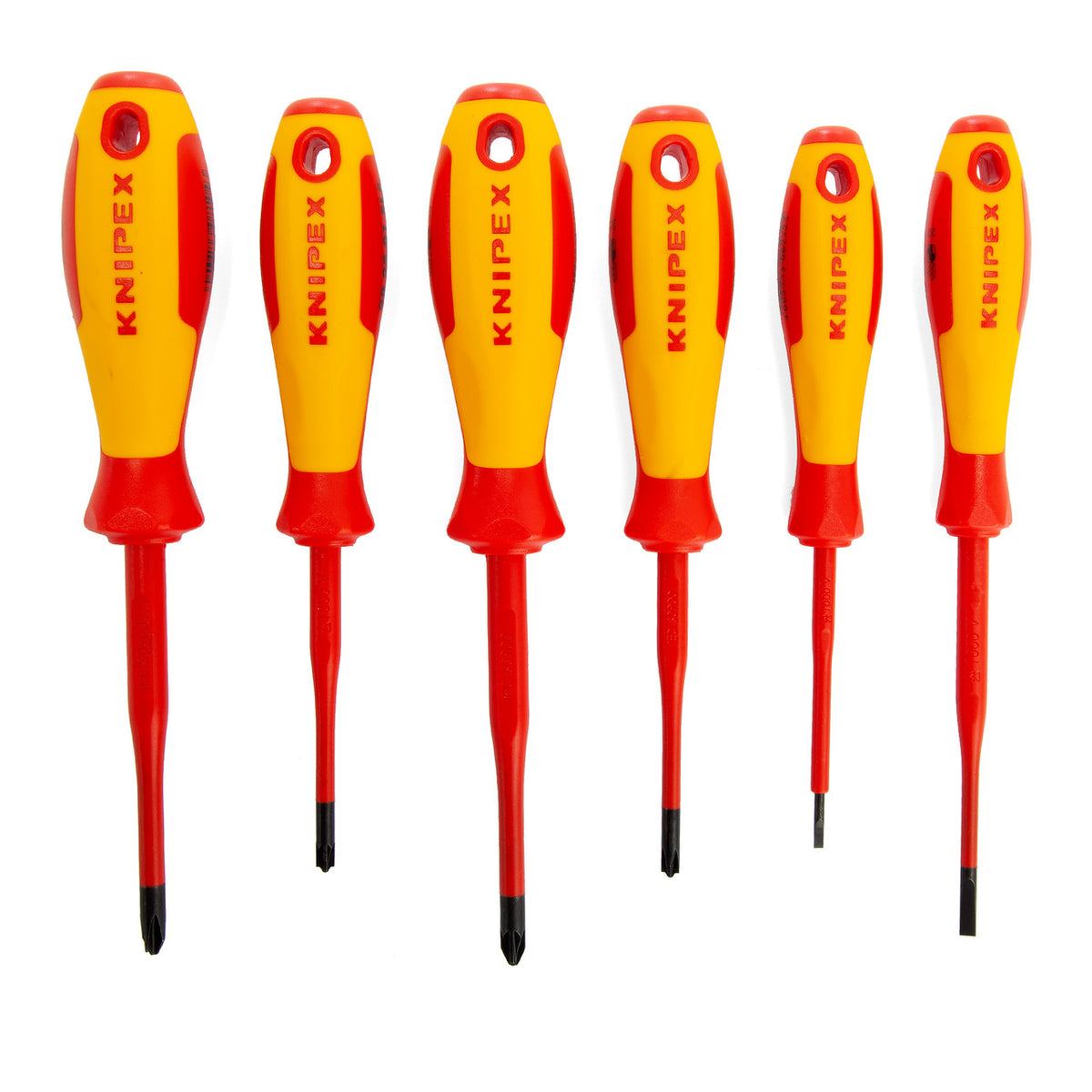 The Knipex 002012V05 is a 6 Piece Screwdriver Set with PlusMinus / Slotted Screwdrivers, VDE tested to 1000V. All have ergonomically optimised dual component handles for fatigue-reduced work and optimum transmission of force.