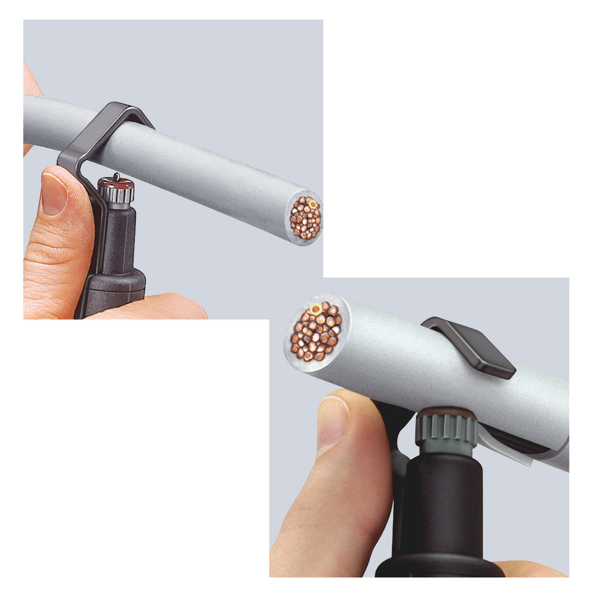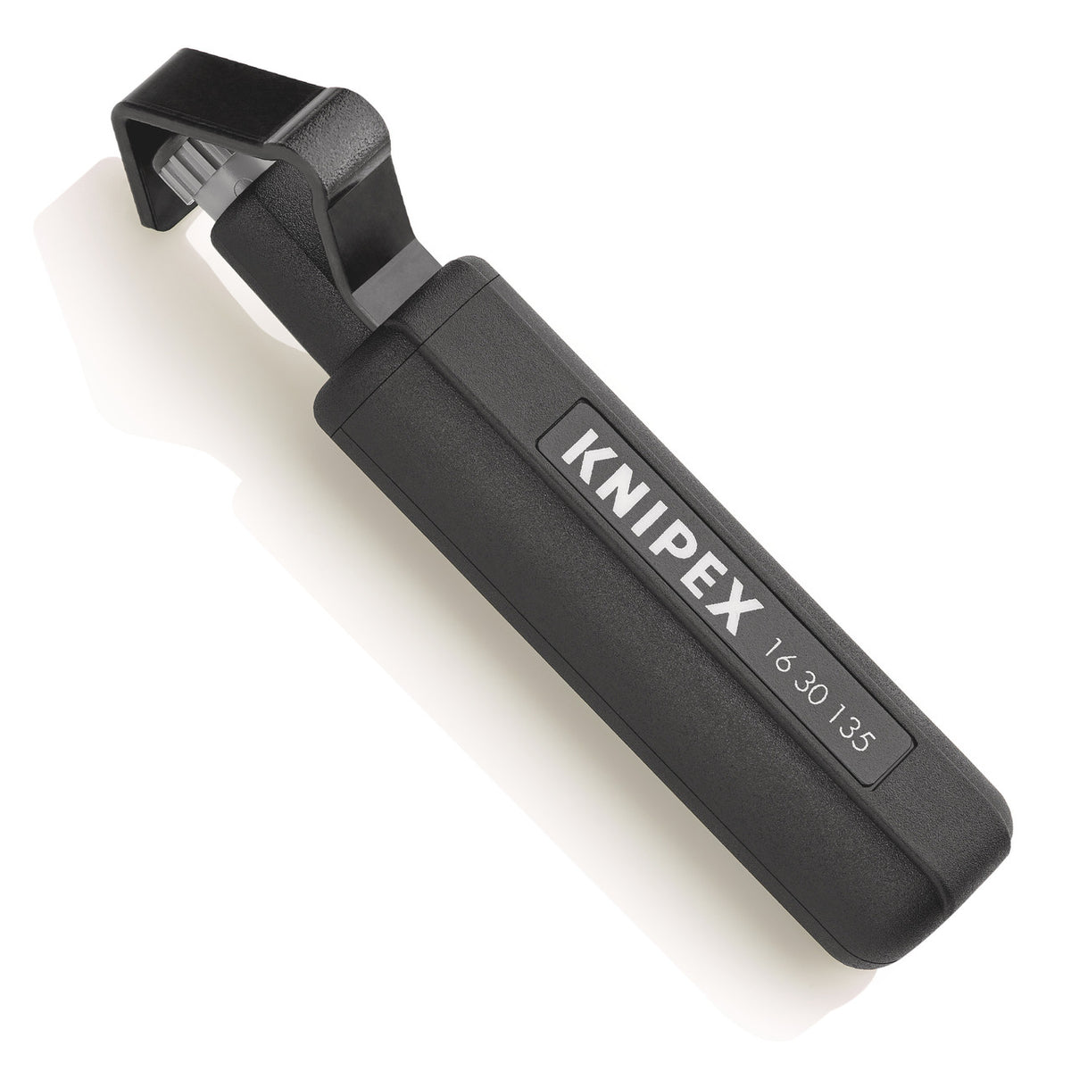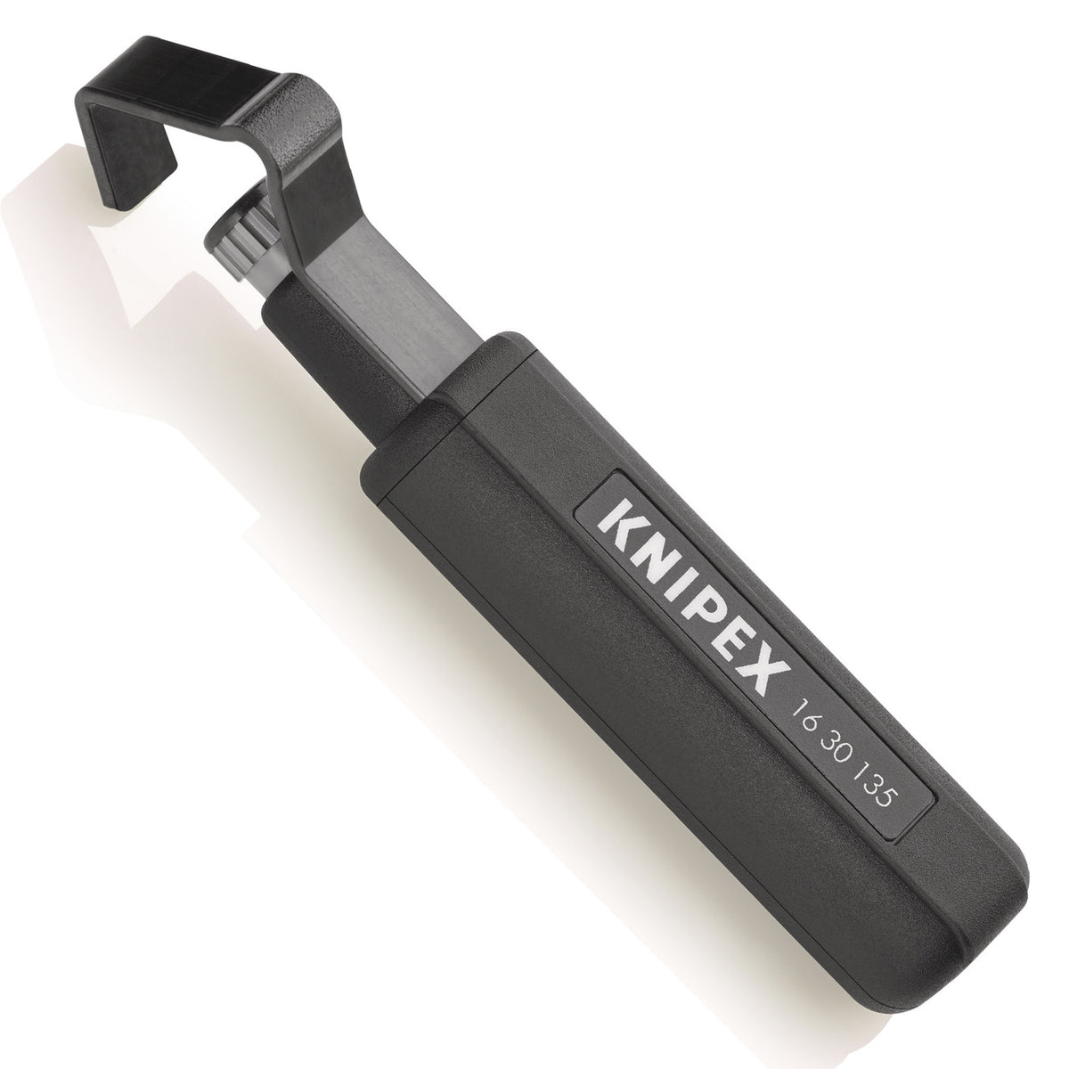 The Knipex 1630135SB Dismantling Tool has been designed for stripping round cable sheaths made of PVC, rubber, silicone or PTFE. It is fitted with a self-tightening holding lever and has a knurled nut for cutting depth adjustment.