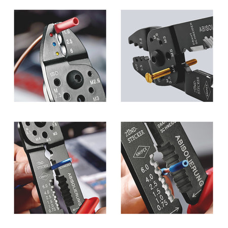 The Knipex 9722240 (loose) Crimping Pliers are an all-round tool with several useful aspects. Ideal in a professional and semi-professional environment especially for smaller projects and tasks when the full range of tools is not available: on the car, in the camper van, on an airfield for model aircraft. Flat and pleasantly light at 300 g, you can easily take them with you in a jacket pocket or the outside pocket on work trousers. Thanks to the screwed, smooth-running and stable joint, all functions on these crimping pliers can be operated well. The multi-component grips sit comfortably in the hand. These universal crimping pliers can also be deployed before crimping: e.g. for cutting and stripping cable and wire. The suitably dimensioned openings prevent damage to the strands during wire stripping. A further function is available. As these crimping pliers are manufactured from high-strength special steel, threaded pins and screws made of soft material can be accurately cut to length, while the thread is protected. Crimping (crushing) plug connectors and cable connectors is an art, and depends on using the right amount of force. There must be enough for the cable connectors and plug connectors to be held securely on the cable, which is important to prevent spark formation and faults caused by loose connections, however plug connectors and cable connectors must not be crushed and then become unsightly and unusable. These crimping tasks can be performed well using the pliers, both on insulated or open plug connectors and on insulated cable connectors.