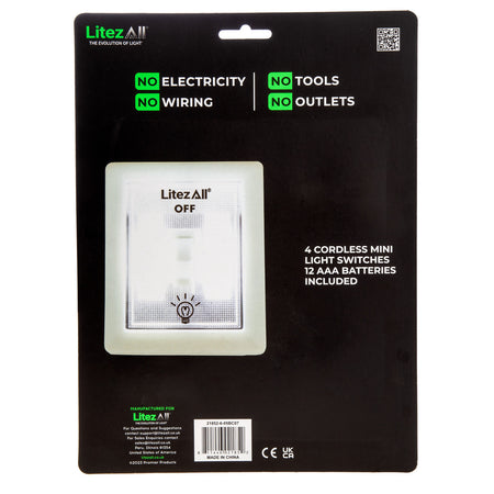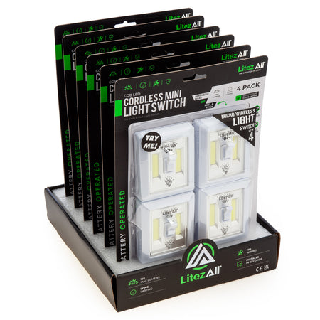 Tired of fumbling in the dark for a light switch? Look no further than the LitezAll 21852 COB LED Wireless Mini Light Switch 4 Pack. This innovative wireless light switch kit is the perfect solution for illuminating any space with ease and convenience. With its powerful 150 lumens of bright light, wireless installation, and long battery life, the LitezAll 21852 is the perfect way to add light to your cupboard under the stairs, shed, garage, or any other area. Say goodbye to dark corners and enjoy the convenience and versatility of wireless lighting. Utilising advanced COB (Chip-on-Board) LED technology, these compact light switches offer powerful brightness with outstanding energy efficiency. With peel and stick pads, 2 magnets to attach to metal or a keyhole mount for a nail or screw.