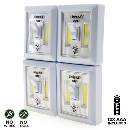 LitezAll 21852 Mini Wireless Self-Adhesive COB LED Light Switch 150 Lumens (4 Pack)