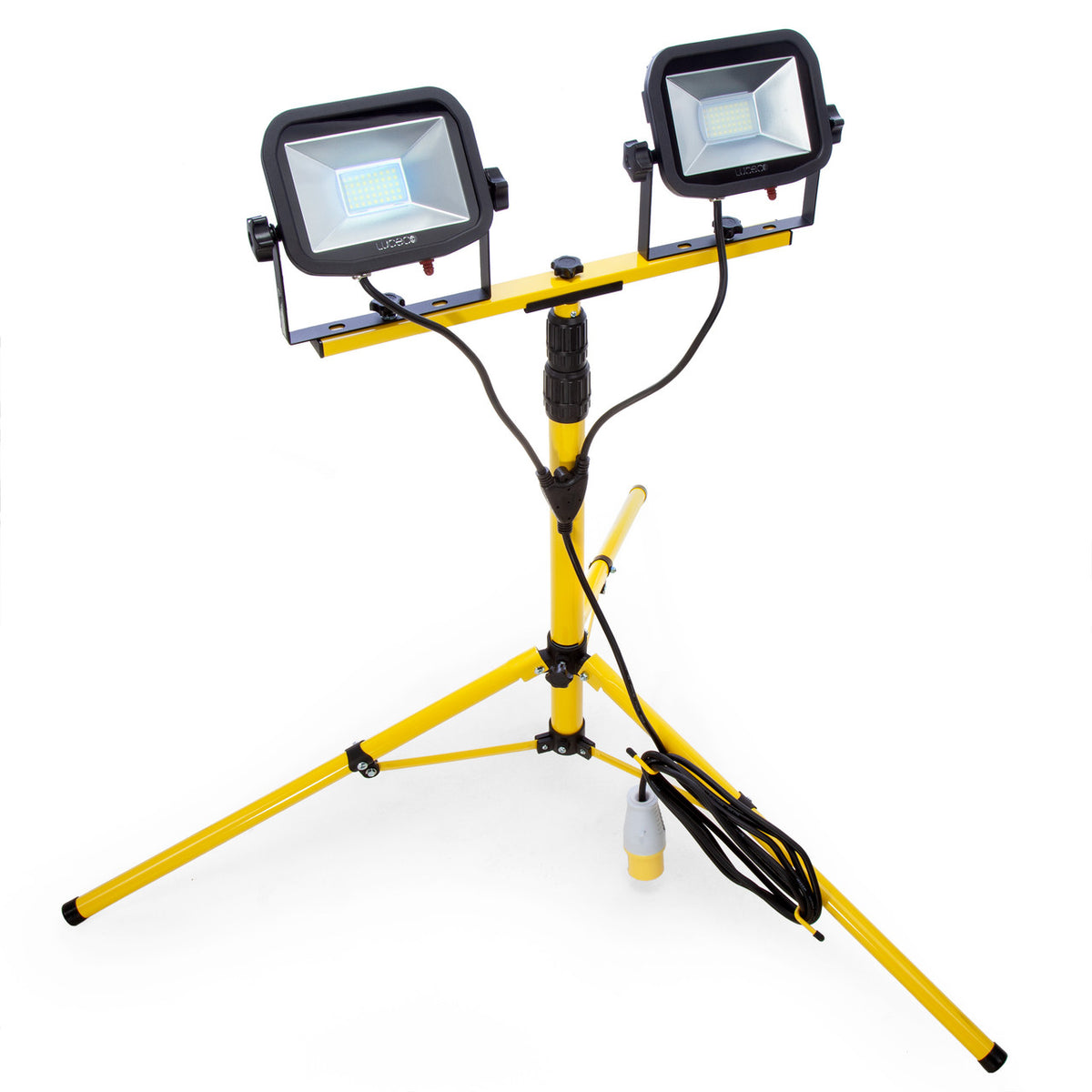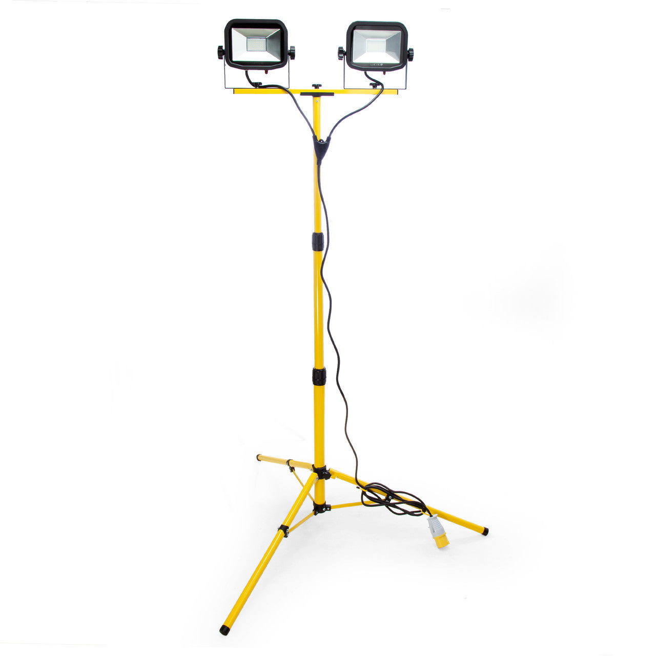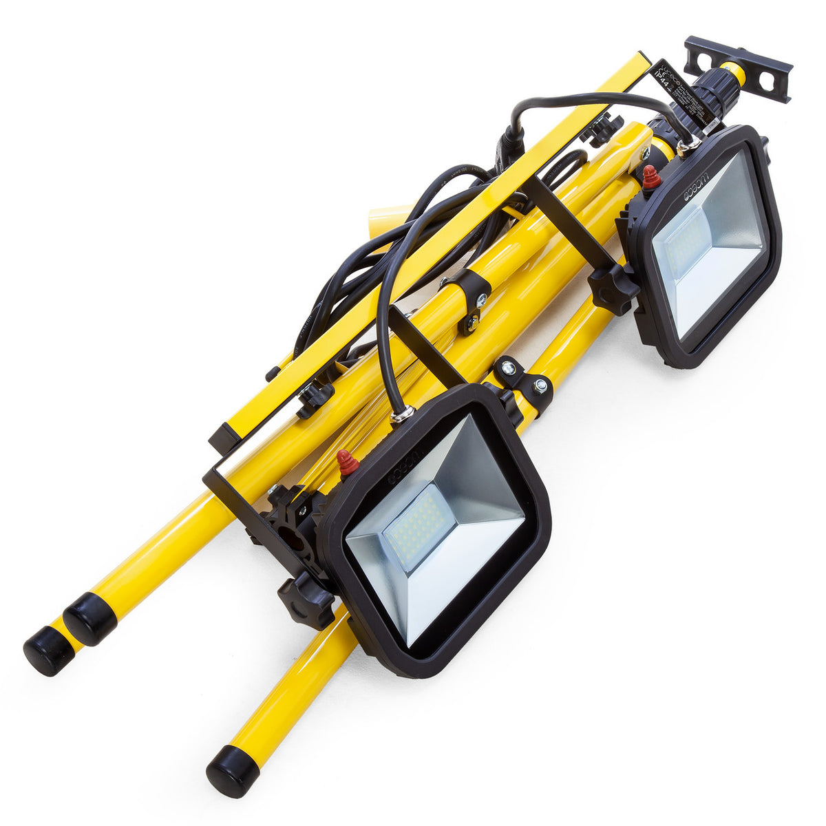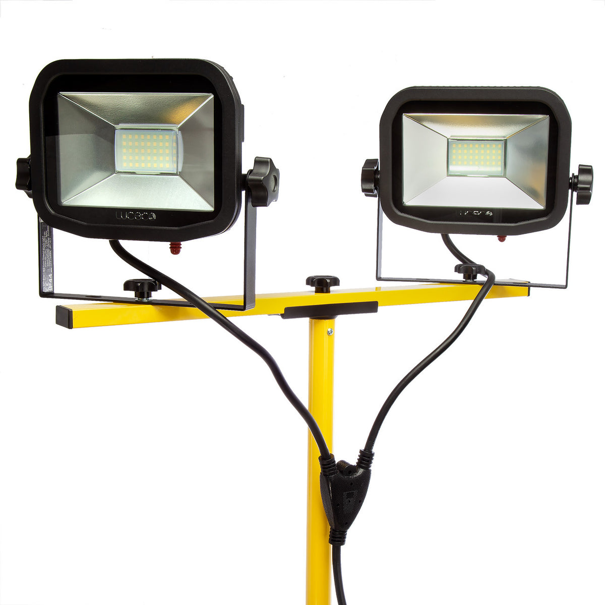The Luceco LSLTTW2181V-01 consists of twin LED lights with a total output of 3600 lumens. They are mounted on a height adjustable tripod rising to a height of 1.5 metres. Each light has independent weatherproof switchgear and can be tilted and turned to any angle.