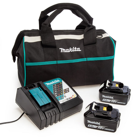 This exclusive Toolstop deal is made up of 2 x BL1850B 5.0Ah Batteries, a Makita DC18RC Compact Charger and a Small Wide Mouth Tool Bag