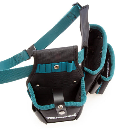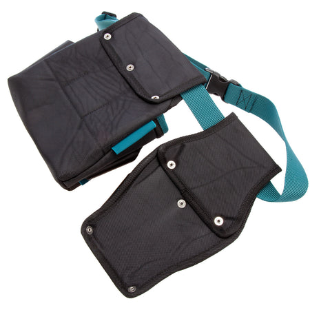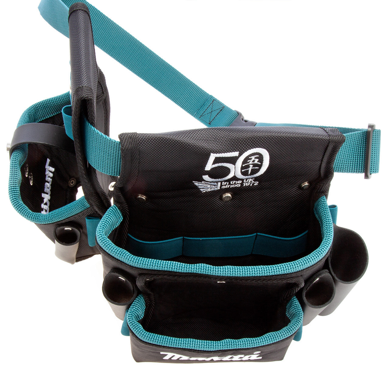 Celebrating 50 years in the business of selling tools and accessories, Makita offer the Limited Edition 50th Anniversary 3 Piece Belt and Pouch Set. With a quick-release tool belt, universal drill holster and 2 pocket fixing pouch. Both the holster and pouch feature a stitched Makita logo. This is a heavy-duty tool belt made from a robust thick woven nylon material with leather used in the strap and smaller tool holsters. The pouches are held together with rivets and stitching for a long service life.