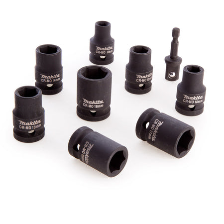The B-54645 from Makita is an 8 Piece Set of Impact Sockets ranging from 8mm - 18mm. All sockets have a 1/2 Drive and included in the Set is a 1/4 Inch Adapter.