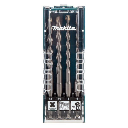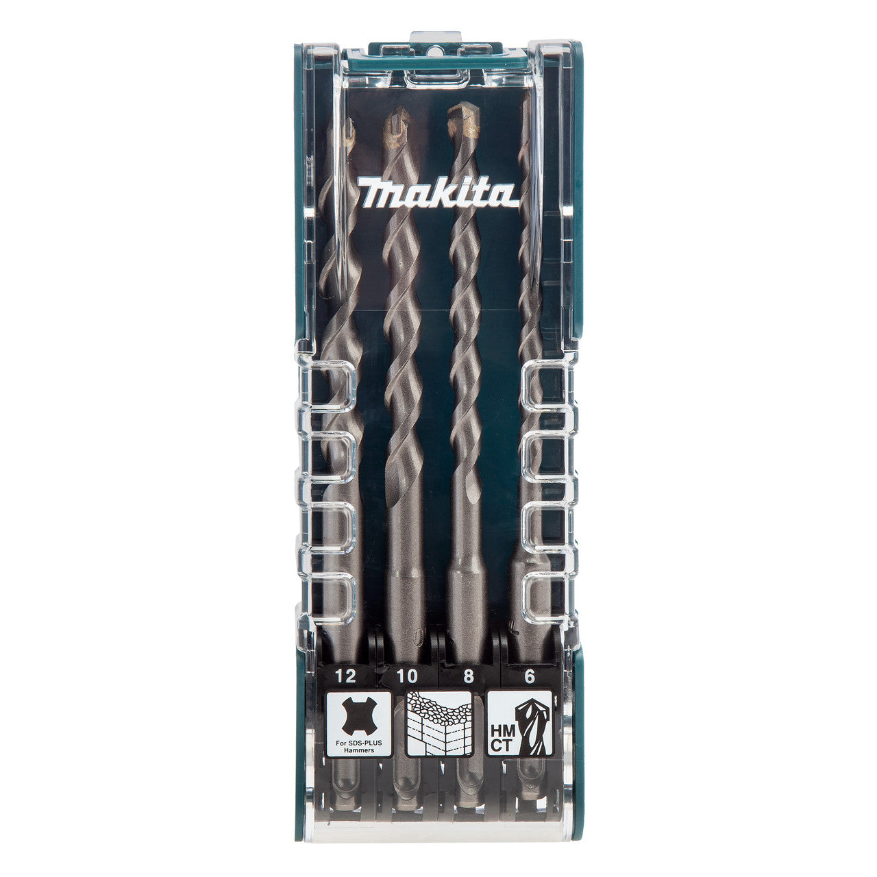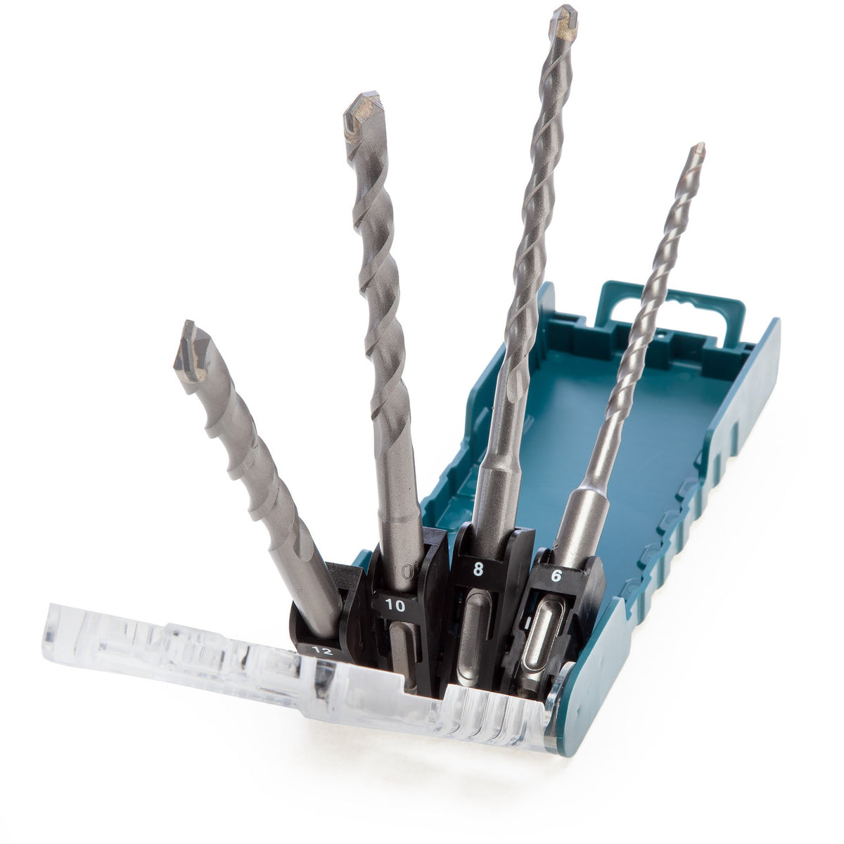 The Makita D-74756 is a 4 Piece Set of SDS Plus Drill Bits in a clear-fronted plastic case. The Bits are in 6mm, 8mm, 10mm and 12mm sizes and are suite for drilling in concrete, brickwork and masonry.