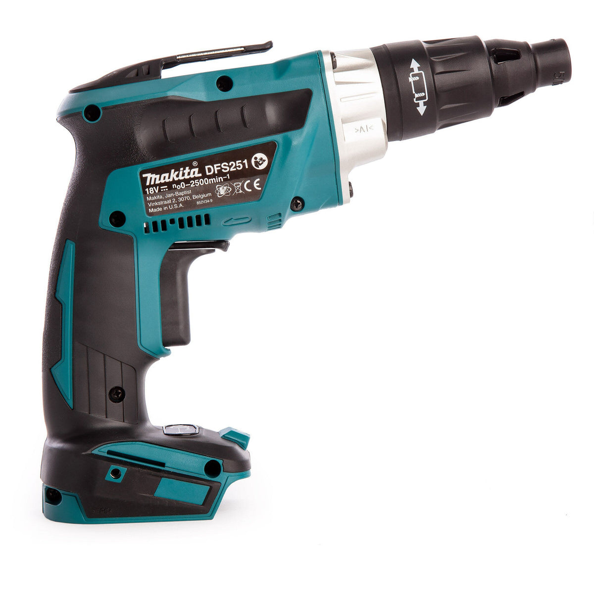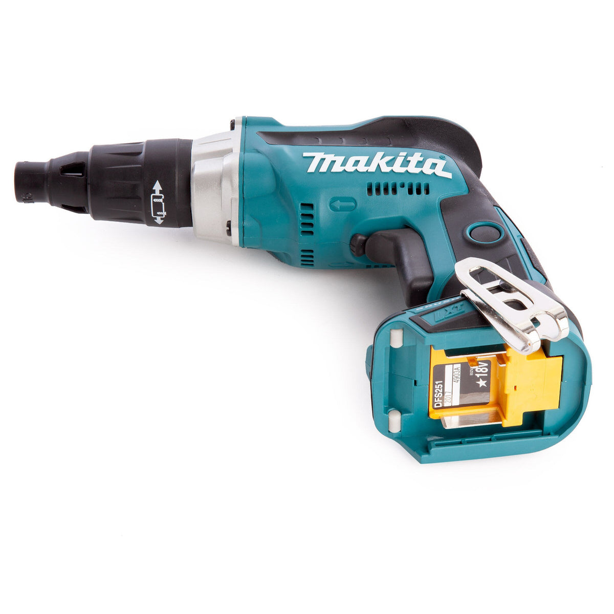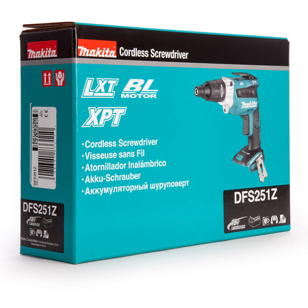 The Makita DFS251Z is a Cordless Body Only Screwdriver powered by 18V Li-ion batteries. The machines development has been based on the model DFS452 and aimed specifically at TEK applications. Brushless Motor technology gives the DF251 a no load speed of 2500rpm. It has a Magnetic 1/4 Inch Hex Driving Shank and comes with a Belt Clip. Sold without charger or batteries in a cardboard carton.