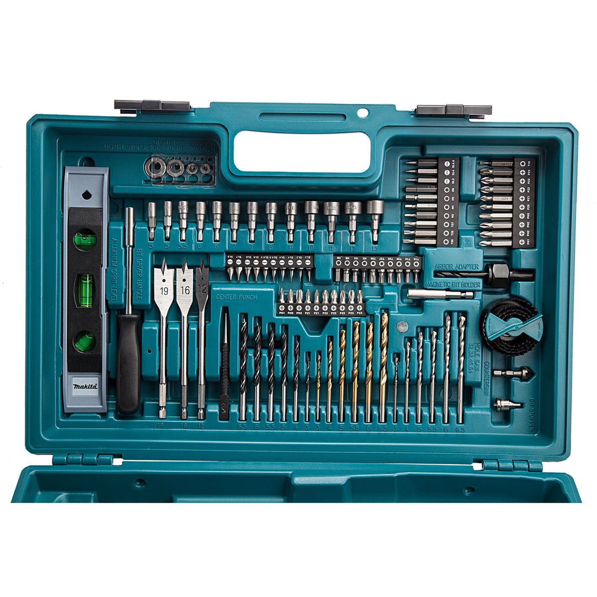 - 13 x Nutdrivers, 4 x Drill Stop, 1 x Hex key, 2 x Screw Holders, 1 x Center Punch, 1 x Counter Sink, 6 x Brad Point Drills, 6 x HSS Drills, 6 x Masonry Drills, 3 x Flat Bits, 5 x Hole Saws, 1 x Bit Driver Handle, 1 x 8" Aluminium Spirit Level, 30 x 25mm Screwdriver Bits, 20 x 50mm Screwdriver Bits, 1 x 60mm Magnetic Bit Holder