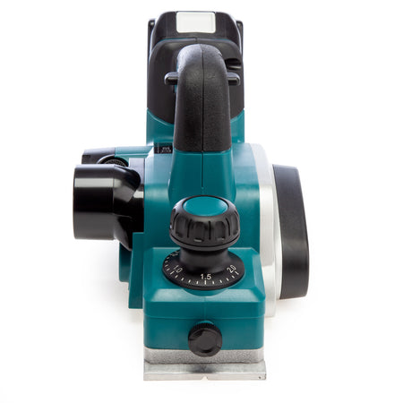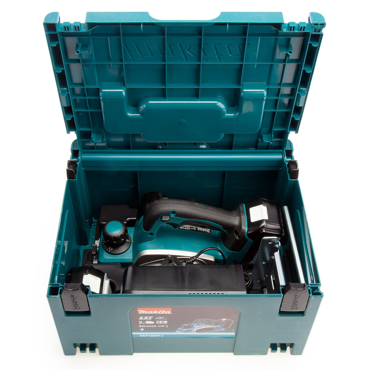 The Makita DKP180RTJ package includes 2 x BL1850B 5.0Ah Batteries, DC18RC Charger, Side Fence and Makpac Case. The powerful 82mm Cordless Planer gives freedom to move around the Jobsite without the constraint of a power socket being required. It has an easy to use adjustable depth setting with a large adjustment knob that has click stops and an easy to read scale with 0.1mm divisions.