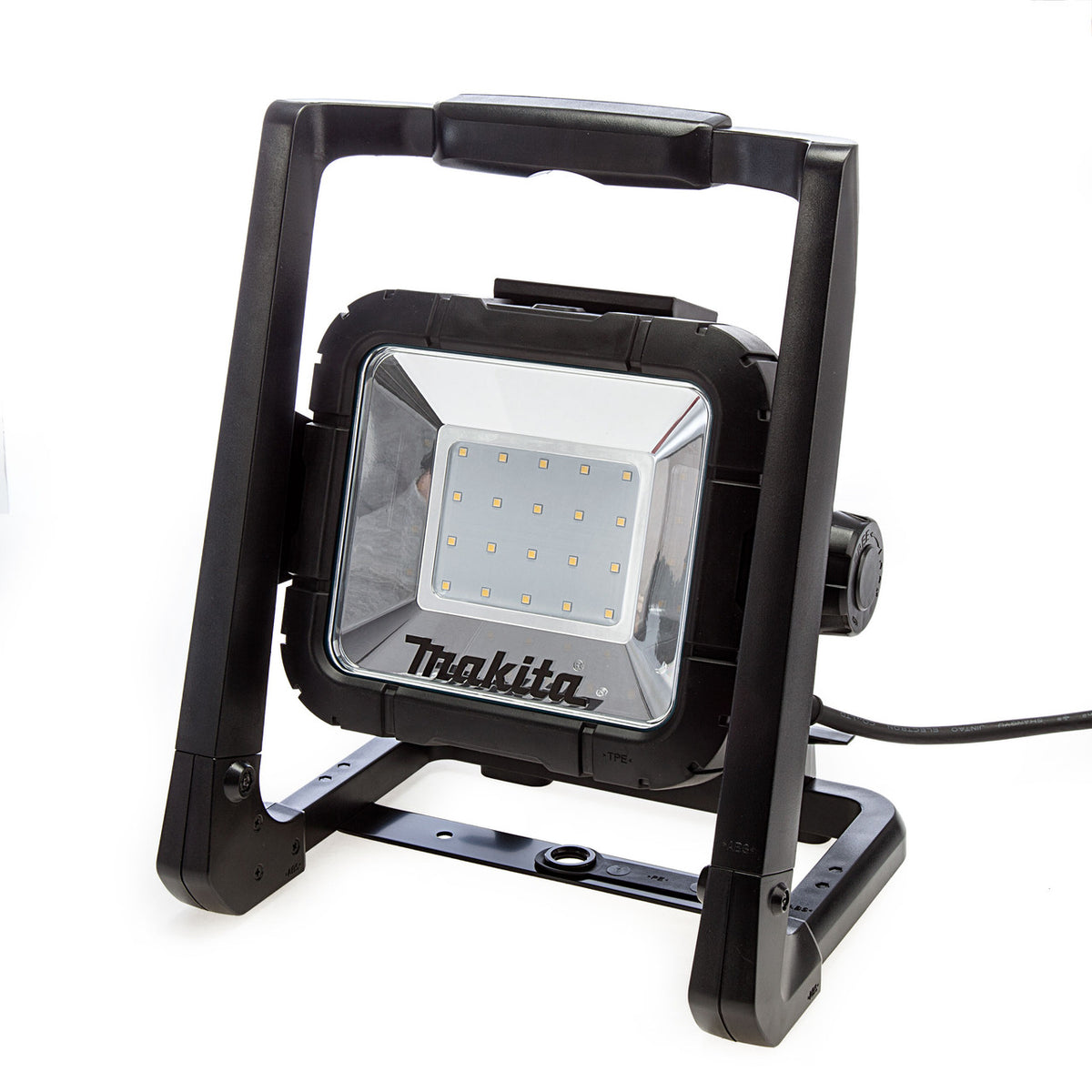 The Makita DML805 LED work-light will run on 110V power or 14.4V and 18V Lithium-ion batteries from the Makita range. The twenty 0.5 watt LED’s provide a bright and even light and there is a full beam and low level setting on the simple push button control. The light unit is mounted in a rugged moulded carry cradle with flat base and top handlet hat can serve as a hanging bar. A simple rotating knob releases the angle setting which can spin through 360°. Batteries are not included with this model.
