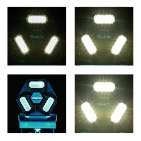 The Makita DML814 is a 12 LED Worklight on a Tripod with up to 3,000 Lumens of daylight white light. The DML814 has 3 small light heads, each with 4 LEDs, which can be pivoted independently for a wide area lighting. There are 3 settings to save battery power and suit the space to be lit, 3000, 1700 and 900 lumens. The height of the tripod is adjustable from 125 to 224cm. It folds down for storage and has a carry case for ease of transportation. Sold as a body only without battery or charger in a cardboard box.