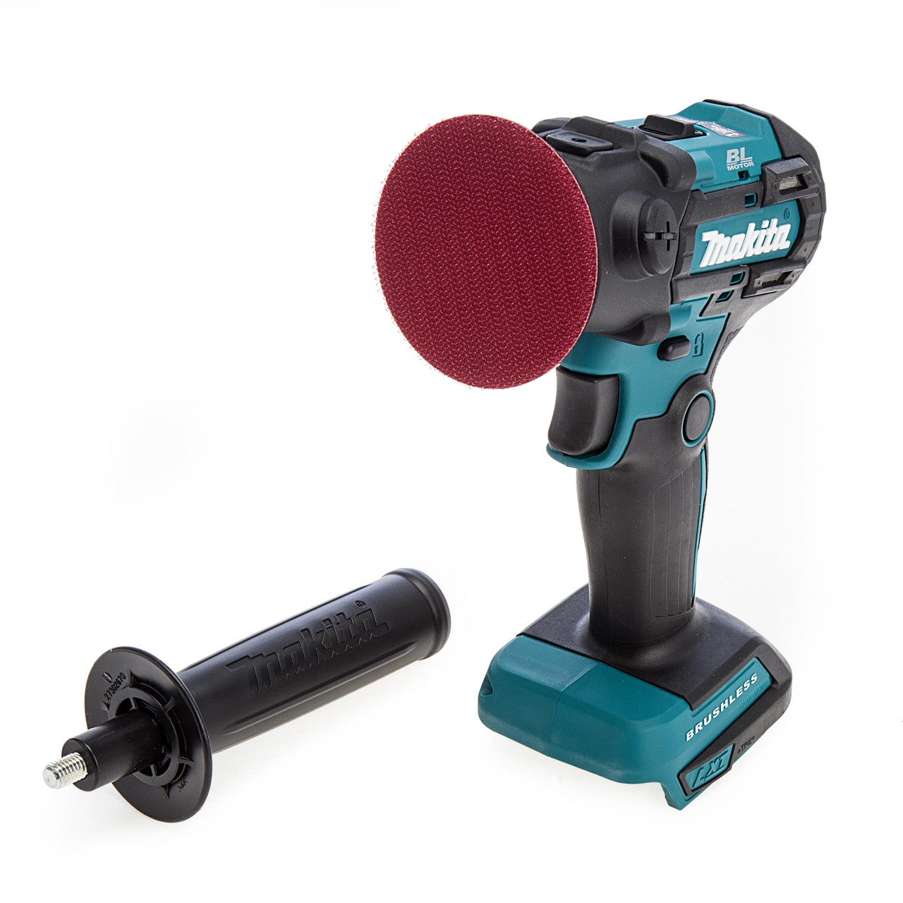 It has variable, mechanical 2-speed and constant speed control. The DPV300Z features a brushless motor with a trigger lock and lock-on switch which lessens user fatigue. It includes an ergonomic soft grip, and an anti-restart function for user safety. The pad/disc is 50mm in diameter, with a polishing no-load speed of 0-2,800rpm and a sanding no-load speed of 0-9,500rpm.