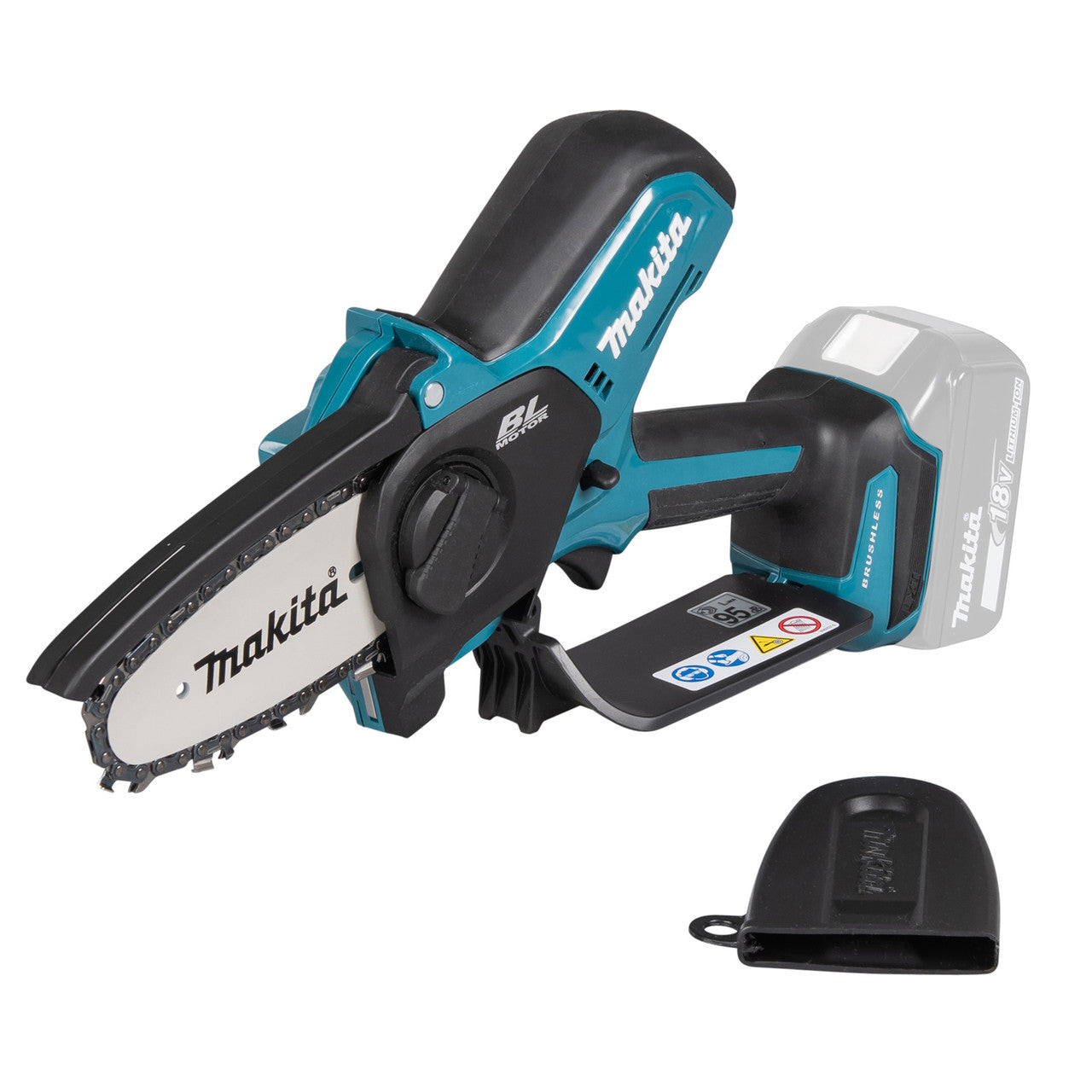 The Makita DUC101Z 18V LXT Pruning Saw with tool-less chain replacement and tension adjustment by lever