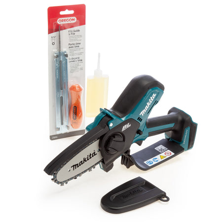 The Makita DUC101Z is a Body Only 18V Pruning Saw with a compact and handy design. The DUC101 offers maximum flexibility and is ideal for pruning and precise corrective cuts. Chopping green waste and small cutting jobs in the garden are also possible without any problems. A moveable guard covers the upper side of guide bar and opens gradually wider as the saw chain cuts deeper into the branch. The DUC101is equipped with a 100 mm bar and tool-less chain and bar tensioning. The new tool-free chain tensioner enables the chain to be changed quickly and easily by simply loosening and closing the lever. When adjusting the chain tension or changing the chain, always keep your safety in mind and wear suitable gloves to protect your hands. Automatic chain lubrication minimizes the chance of stalling due to forgetting to supply chain oil. Sold without a battery or charger in a cardboard box. Comes with 100ml of Chain Oil and an Oregon File Guide and File.