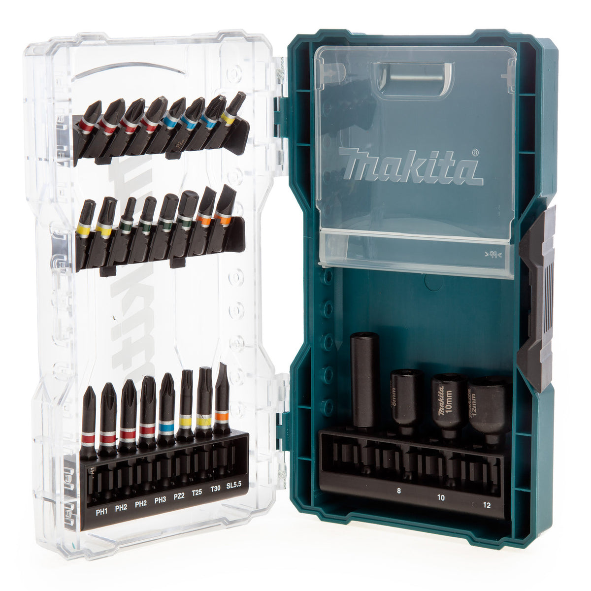 The Makita E-07048 is a 28 piece bit set in a clear plastic case which allows the user to easily identify the contents. There are a variety of the most commonly used bits and nutsetters, handy in the following applications: screwdriving, cabinet making, joinery, assembly, fixings.